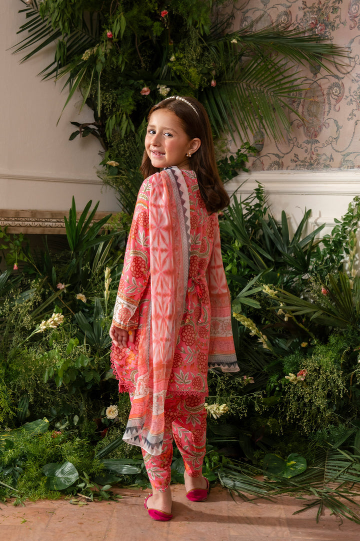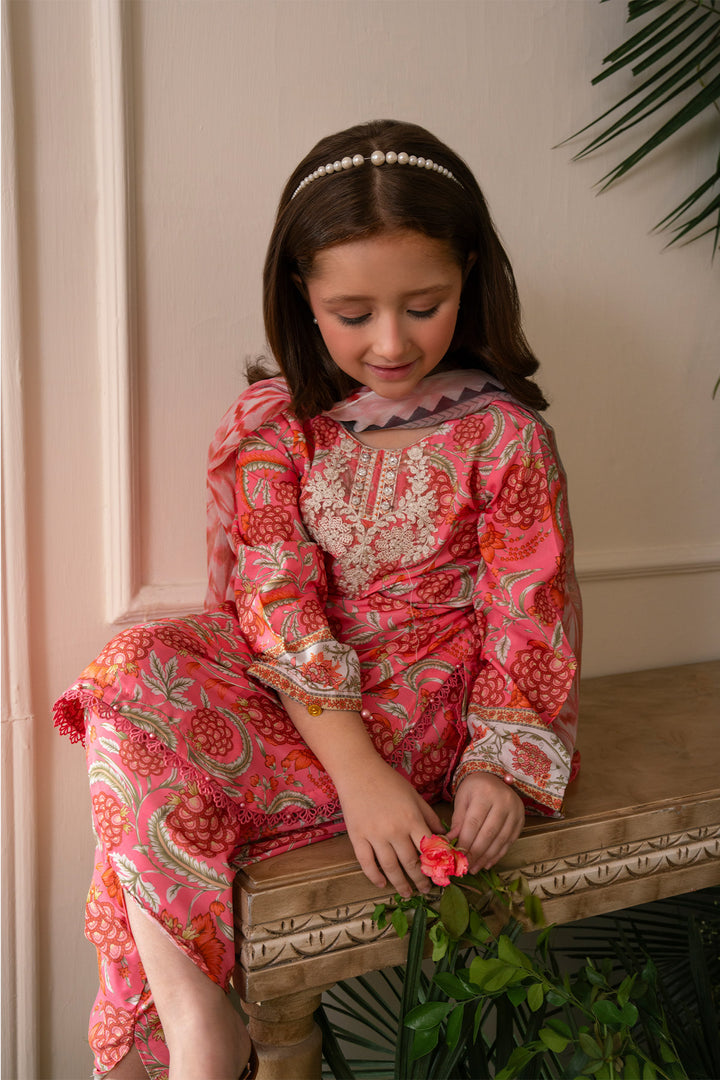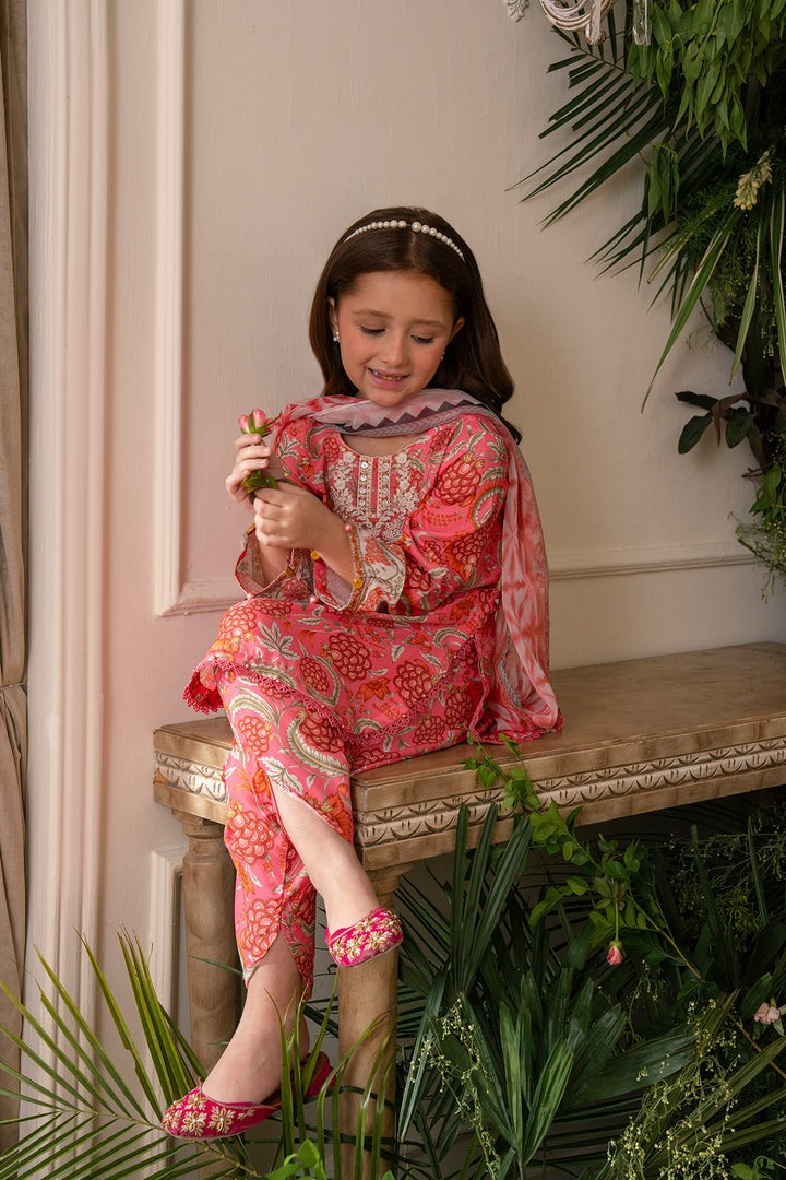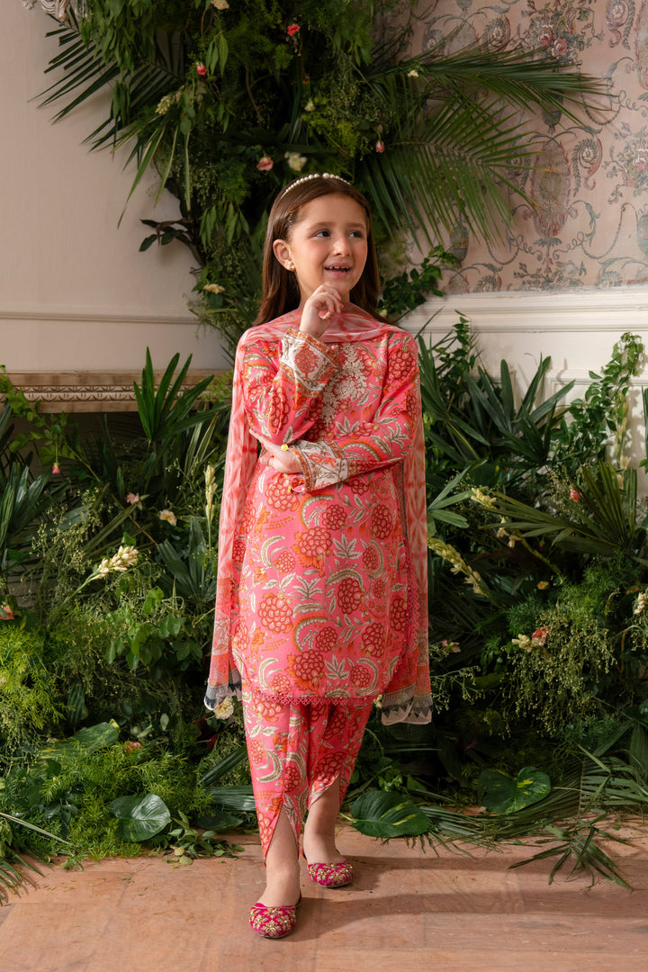 A radiant coral base infused with warm pink and orange tones, highlighted by intricate floral motifs in ivory and soft beige. The ensemble is balanced with earthy undertones and a coordinating chiffon dupatta that adds a breezy elegance.