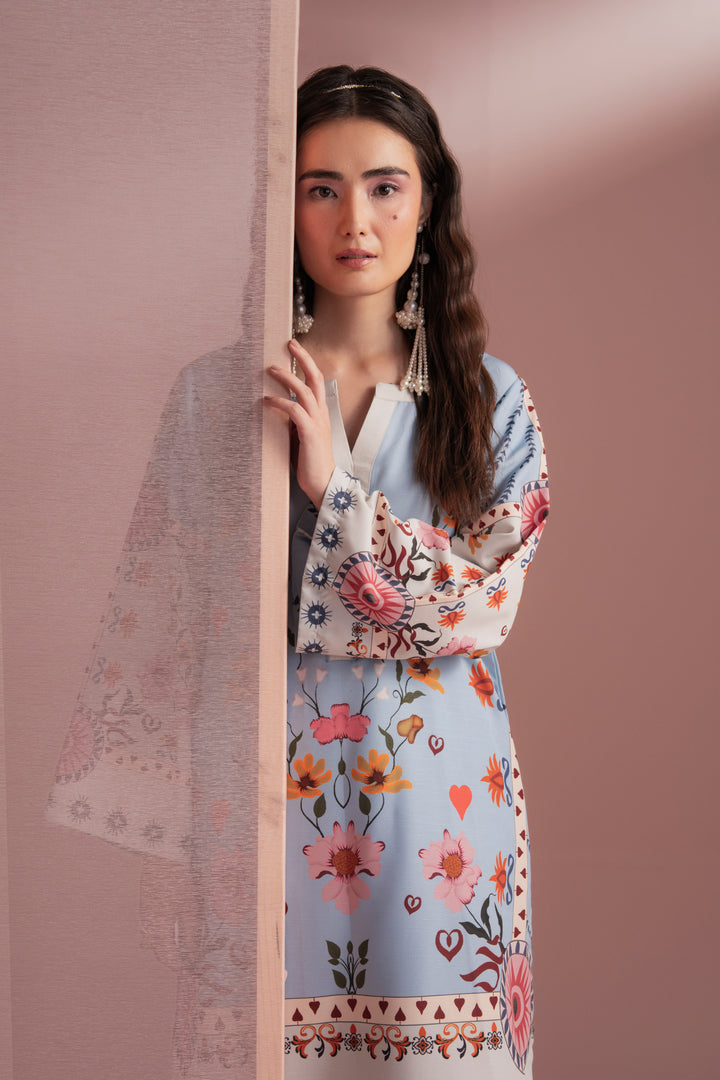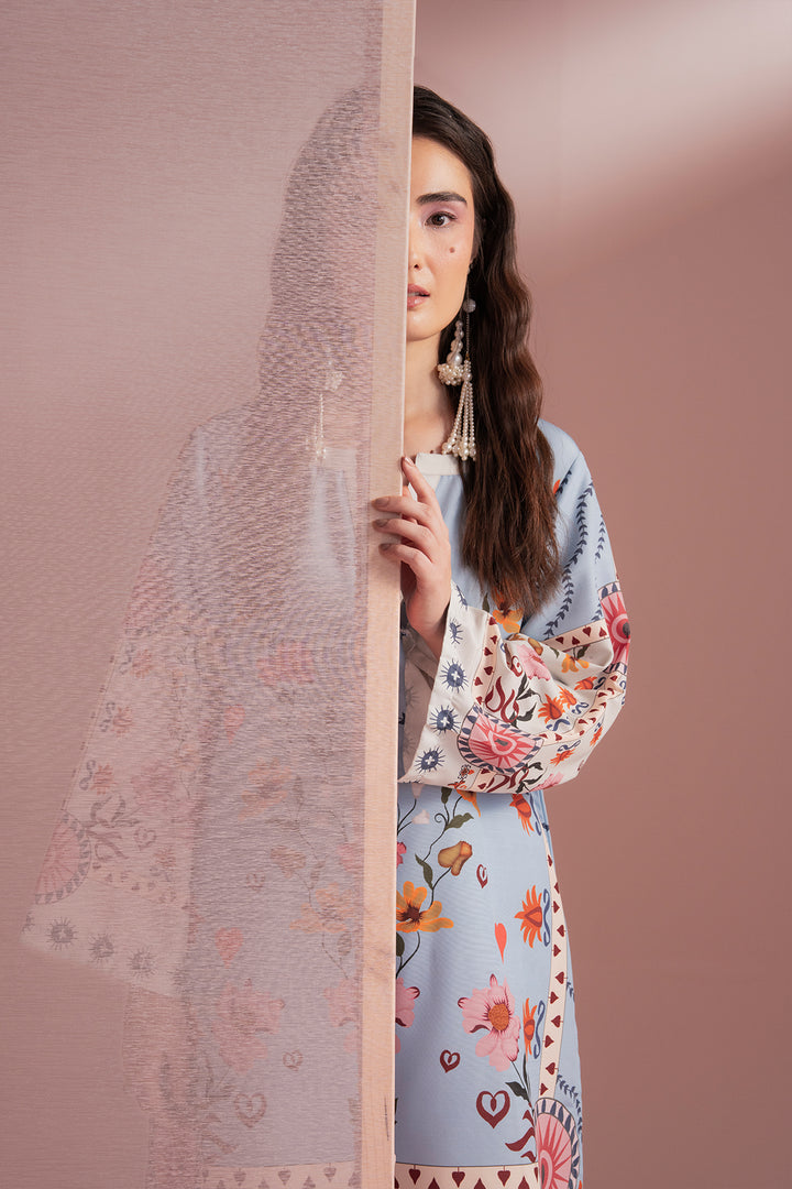 Afsheen embodies the charm of delicate florals and soft pastels. The sky-blue base is uplifted by vibrant floral patterns and ornamental borders that exude a timeless elegance. Perfect for casual brunches or serene afternoon gatherings, this look captures the essence of effortless grace from the Minnah Fall Collection by Aik Pret.