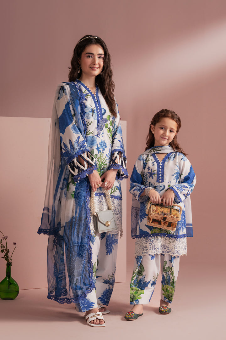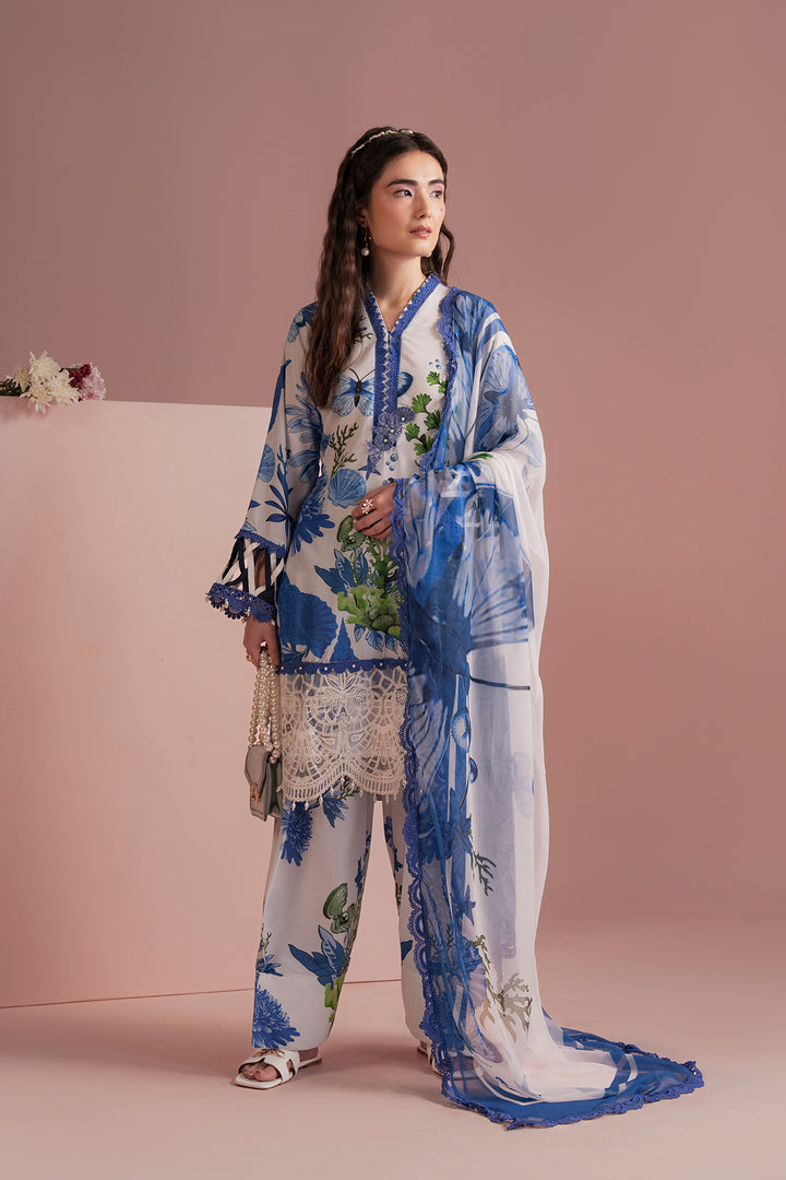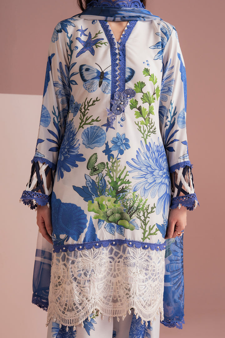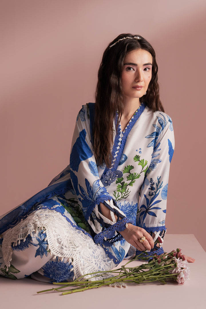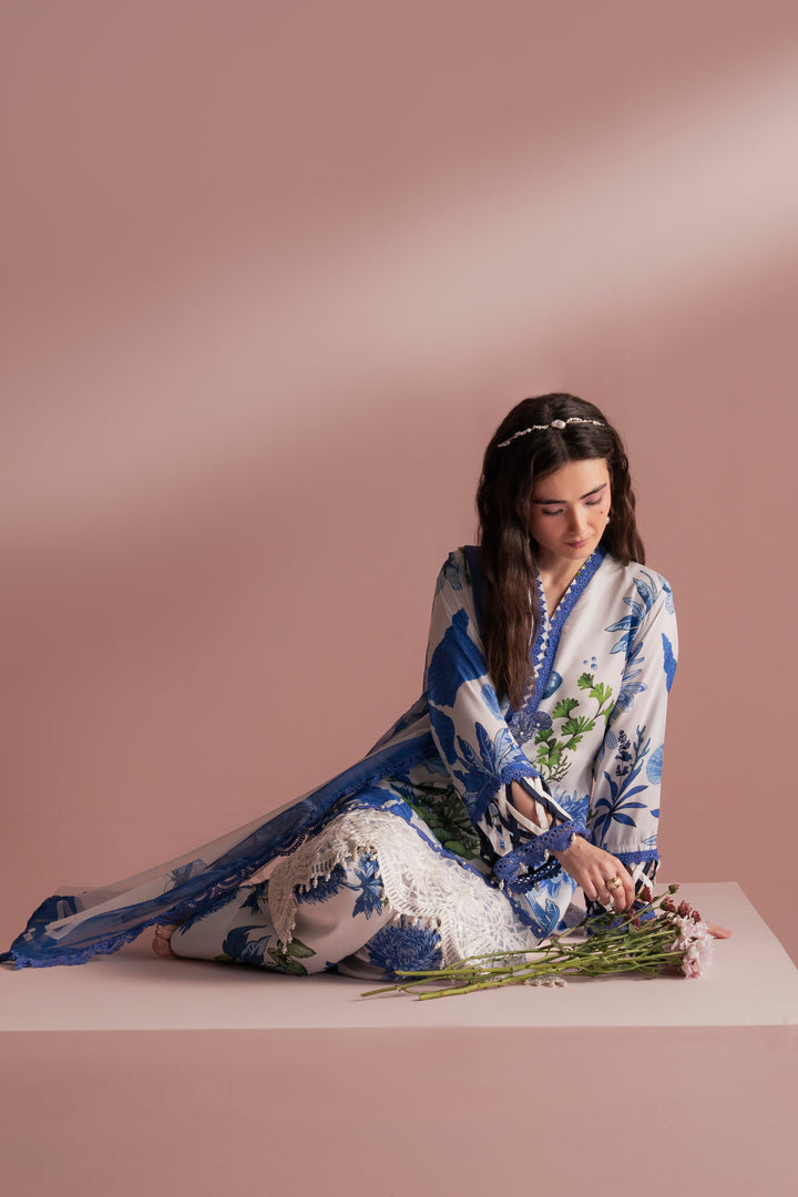 Azure captures the serenity of nature through its rich blue tones and botanical prints. The intricate lace accents on the sleeves and hemline add a refined touch, making it perfect for both daytime sophistication and evening elegance. The look is completed with a flowing chiffon dupatta, adorned with complementary hues that add depth and movement. Perfect for autumn gatherings, cultural festivities, or chic daytime wear, this ensemble captures the essence of effortless grace with a contemporary twist.