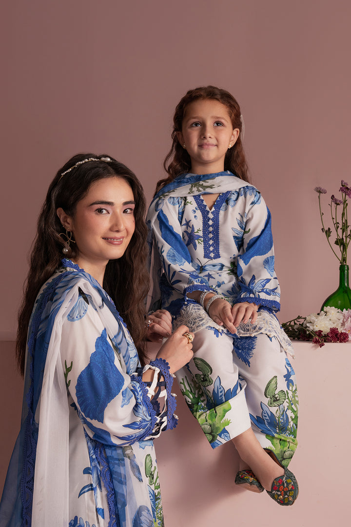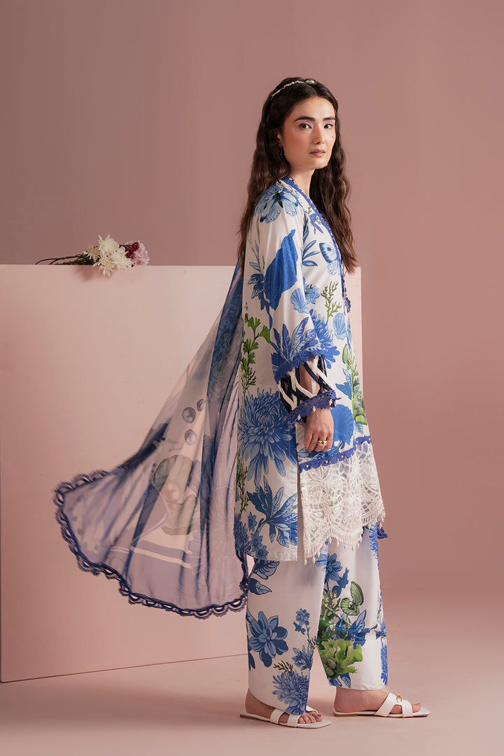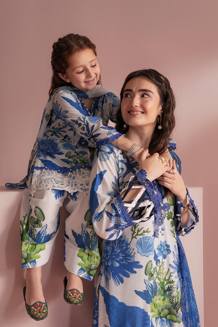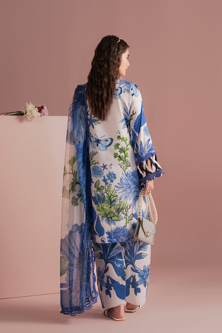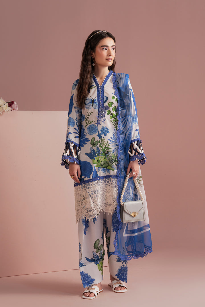 Azure captures the serenity of nature through its rich blue tones and botanical prints. The intricate lace accents on the sleeves and hemline add a refined touch, making it perfect for both daytime sophistication and evening elegance. The look is completed with a flowing chiffon dupatta, adorned with complementary hues that add depth and movement. Perfect for autumn gatherings, cultural festivities, or chic daytime wear, this ensemble captures the essence of effortless grace with a contemporary twist.