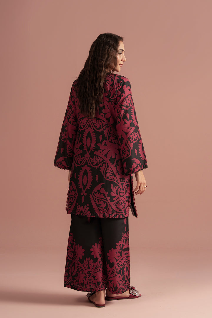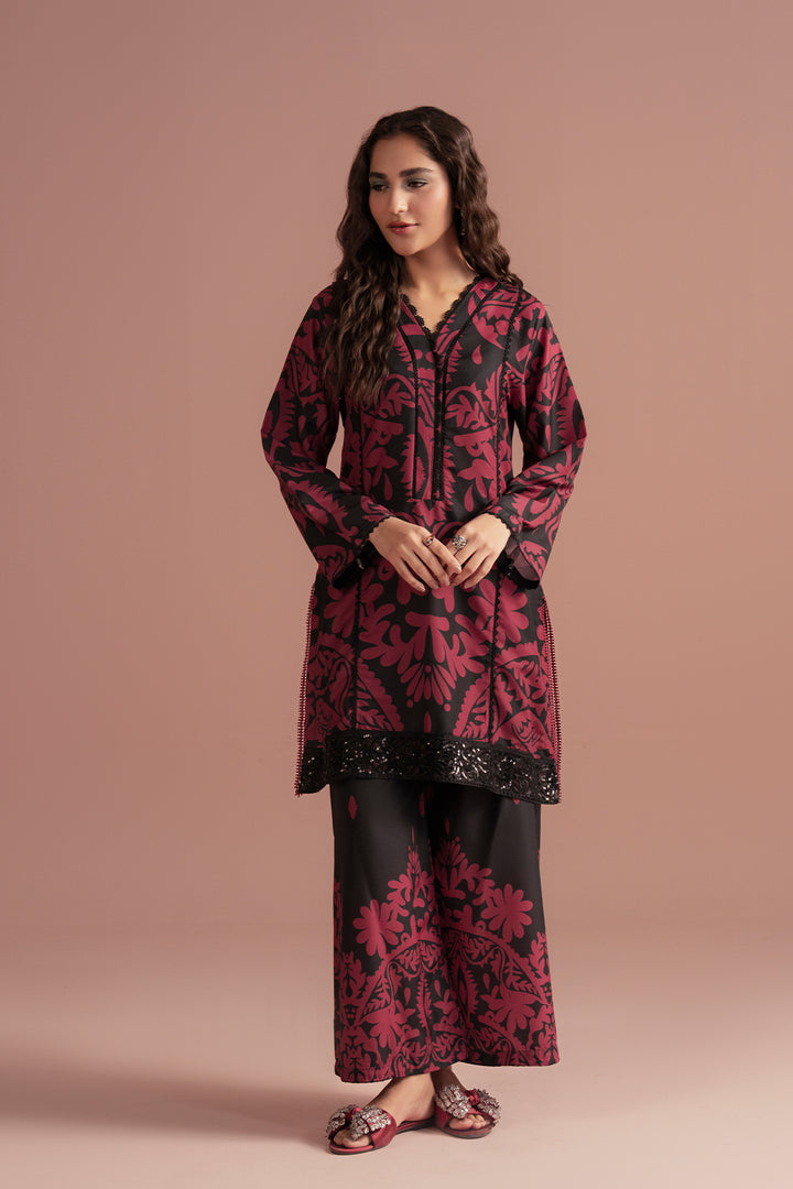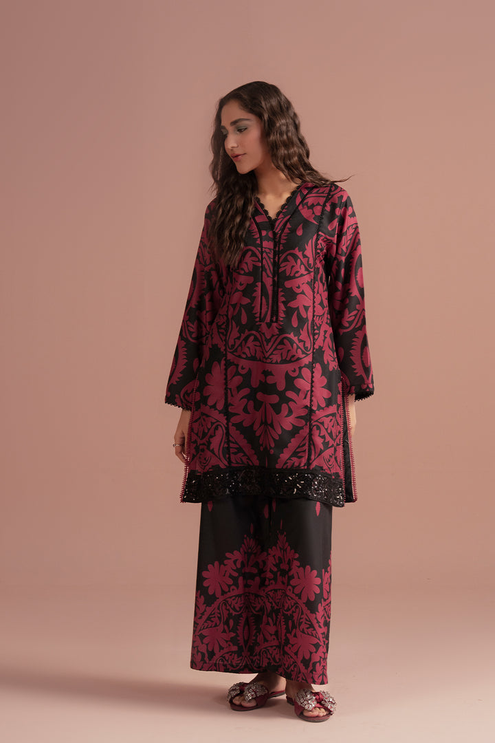 Style: Two-piece outfit with a straight-cut kurta featuring a V-neckline and flared sleeves, paired with matching wide-leg trousers showcasing complementary motifs.