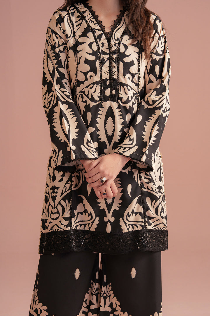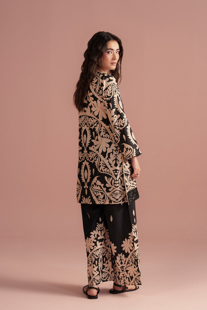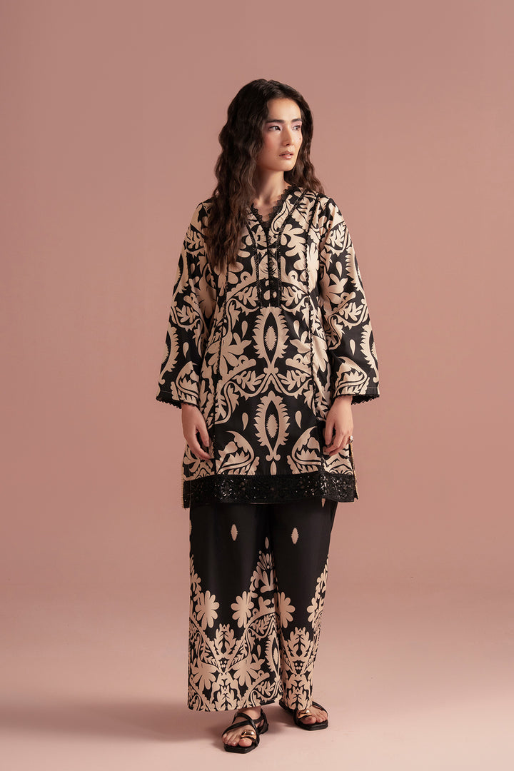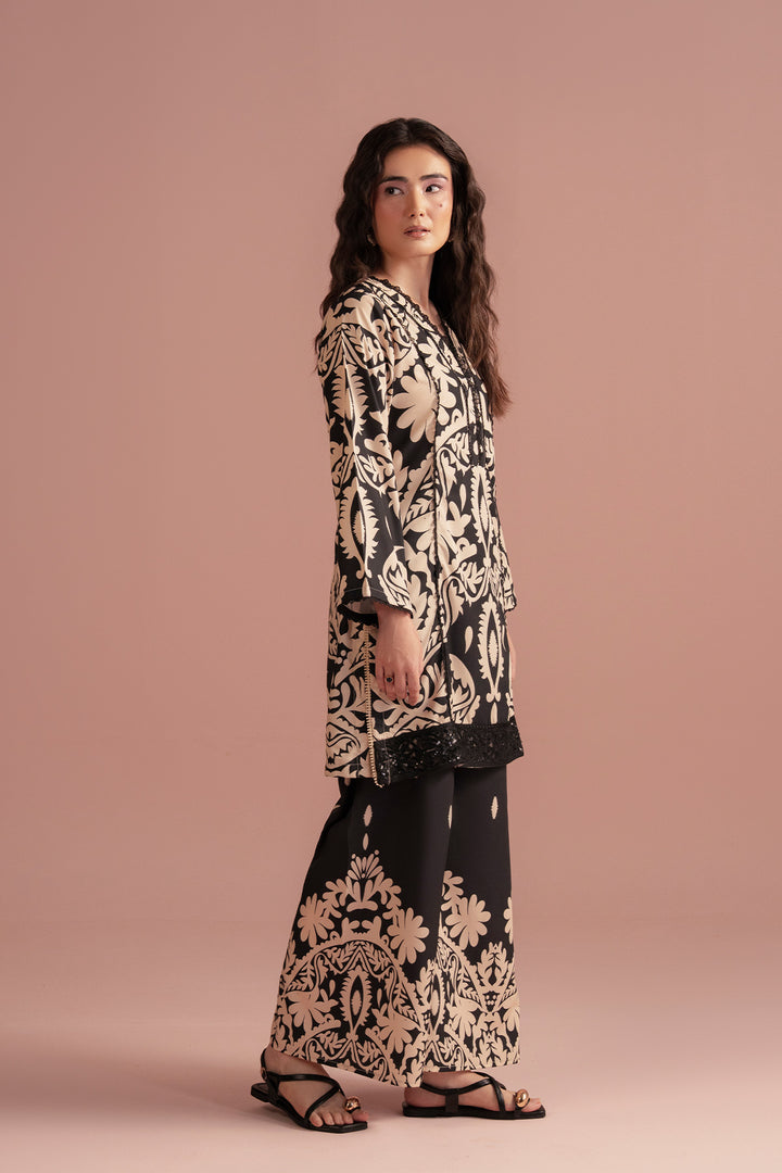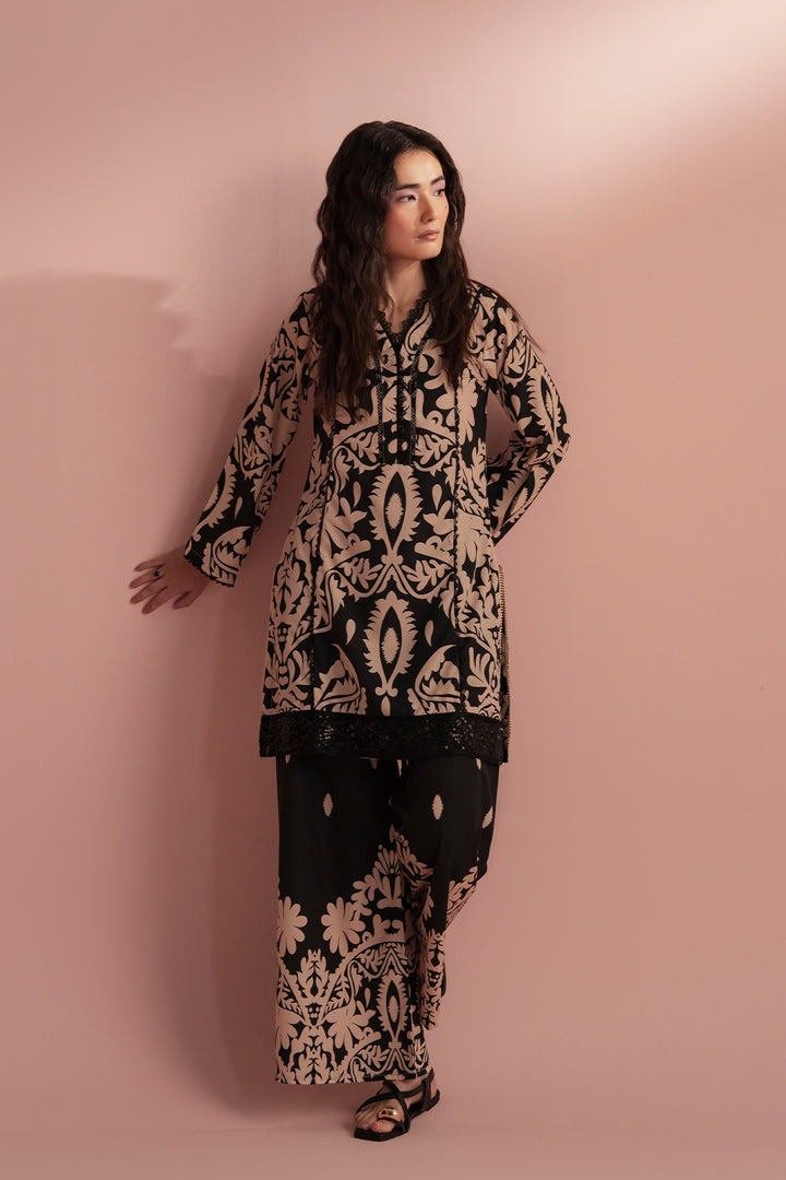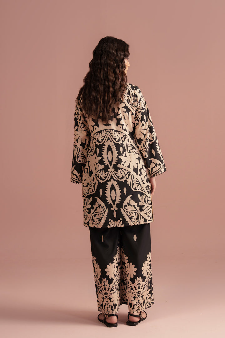 Style: Two-piece ensemble featuring a straight-cut kurta adorned with intricate baroque-inspired patterns, paired with wide-leg trousers that mirror the ornate design.