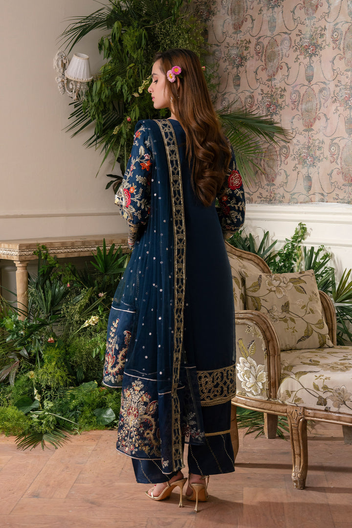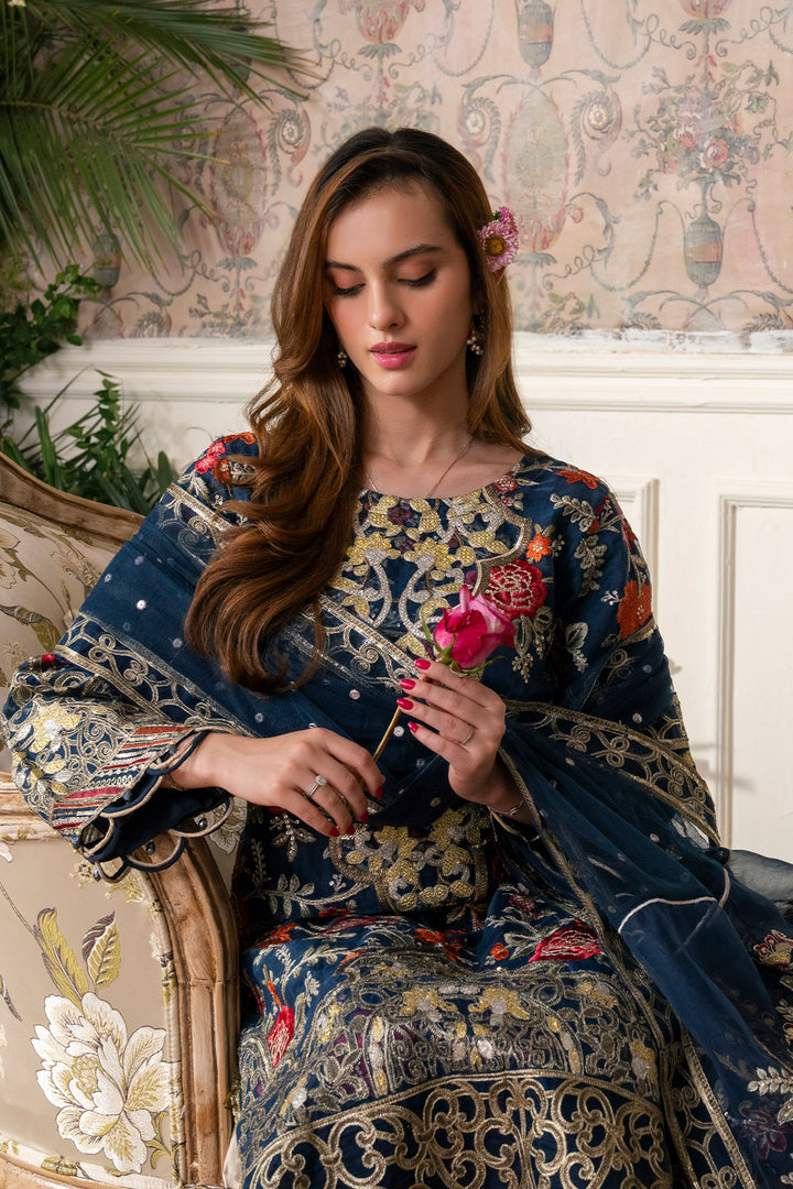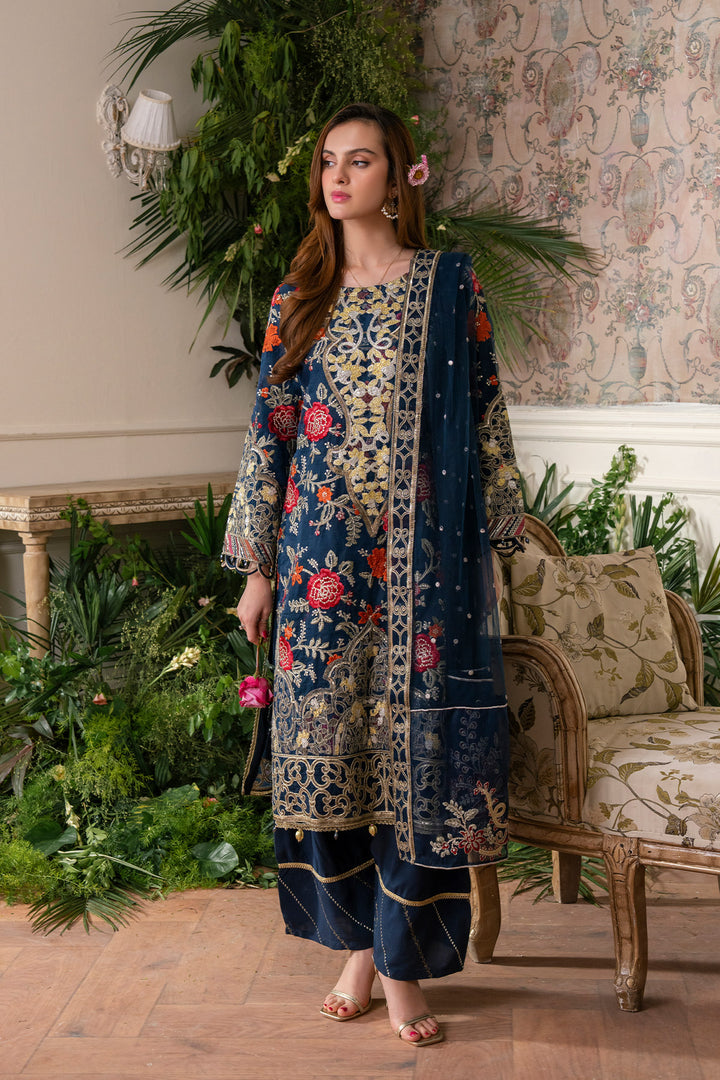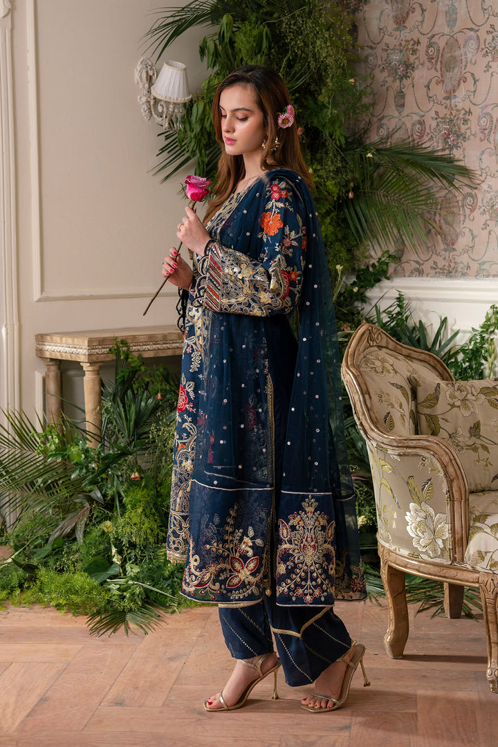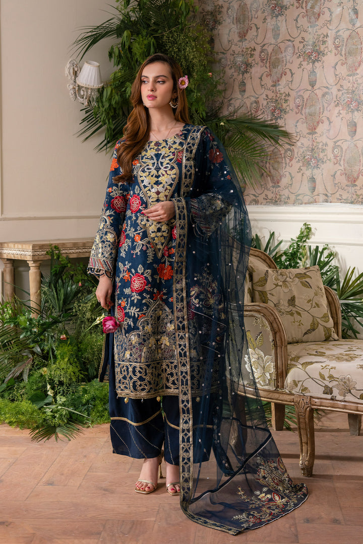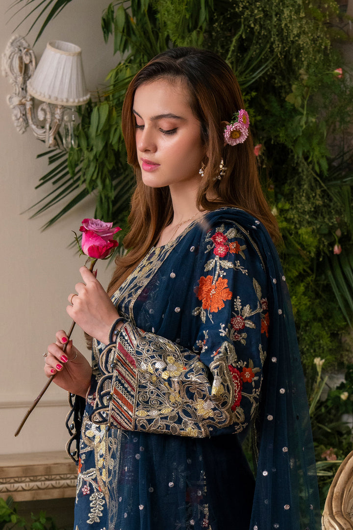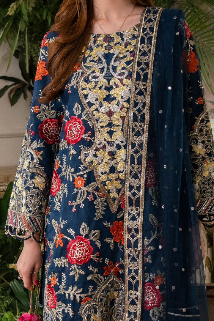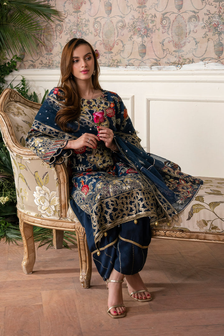 Round neckline featuring intricate tilla, thread, and sequin embroidery