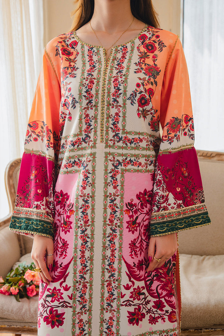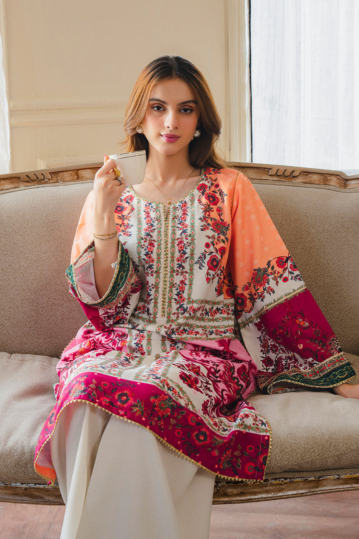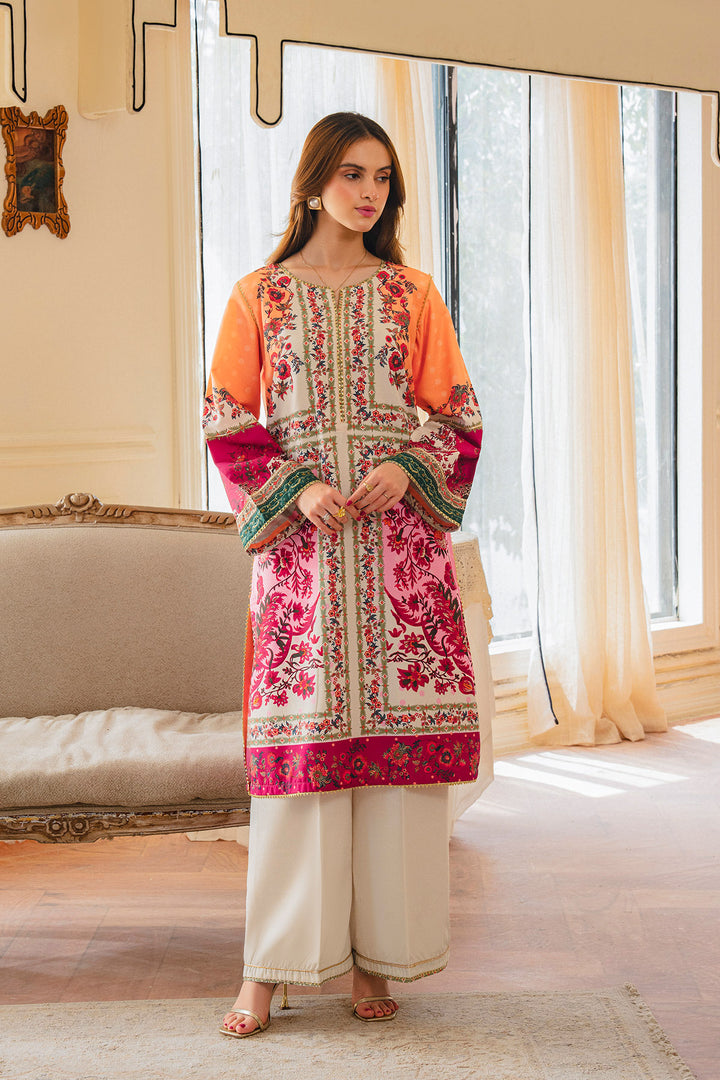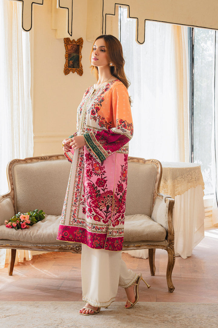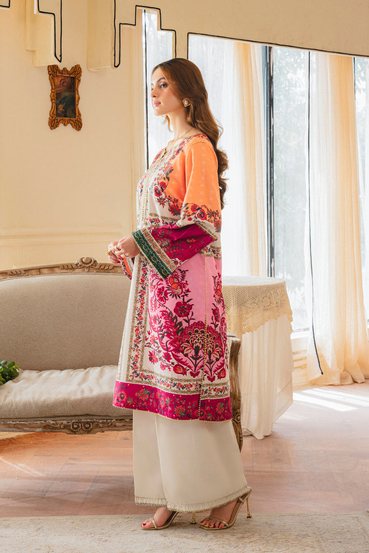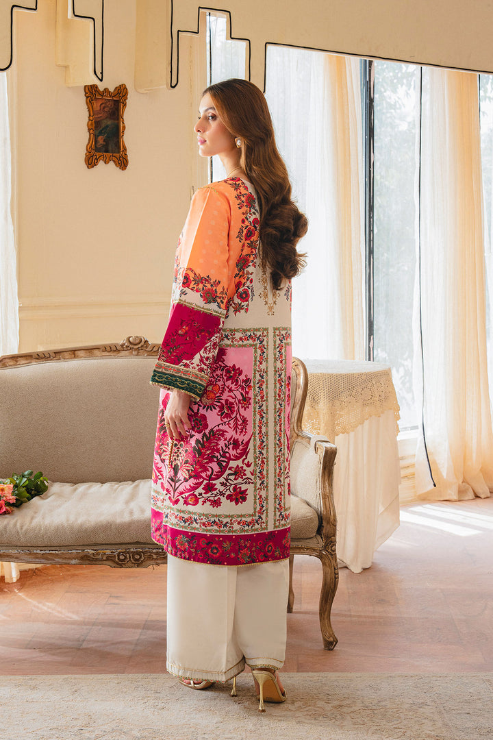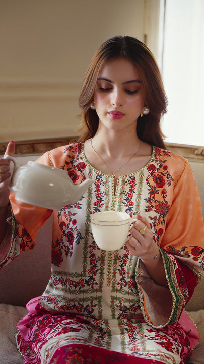 Mehrunisa from Aik Pret’s Arsh Fall ’25 Edit is a celebration of color and craftsmanship. Tailored in premium Twill Khaddar, the long printed shirt showcases intricate floral and geometric motifs that exude artistry and elegance. Paired with classic white trousers, the ensemble with intricate lace detailing strikes the perfect balance between tradition and modernity. The breathable yet luxurious fabric makes it ideal for transitional weather, while the bold hues ensure you stand out at festive gatherings, cultural soirées, or chic daytime events.