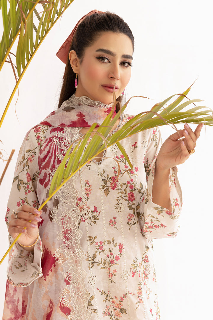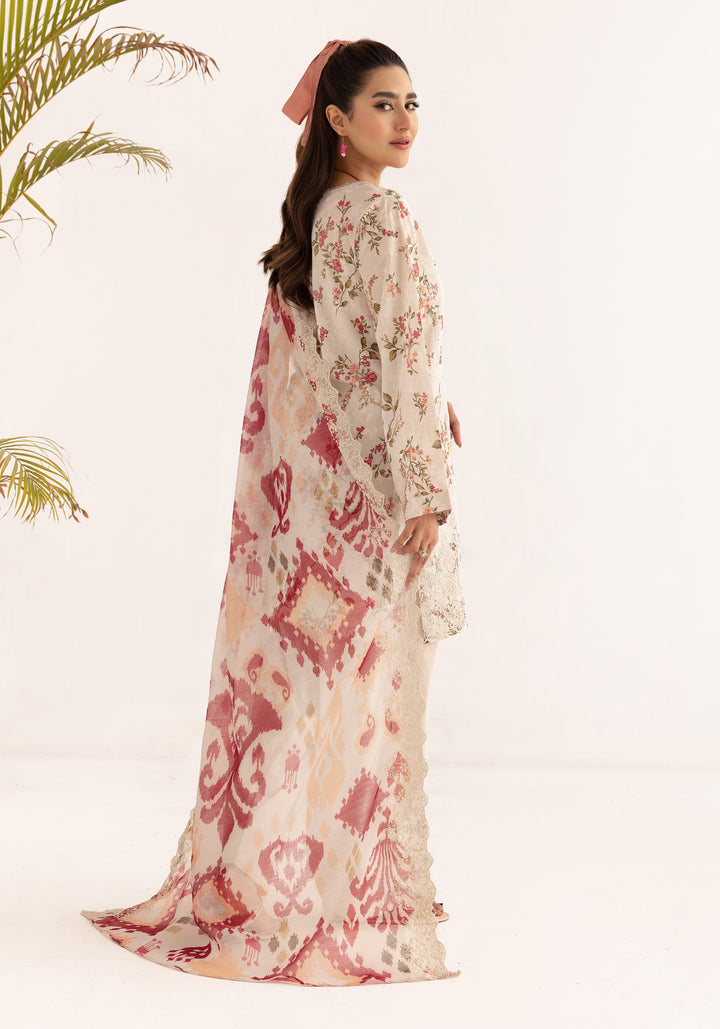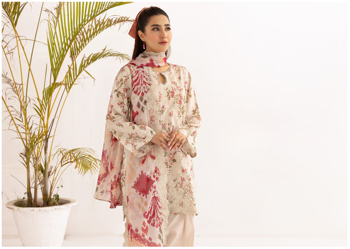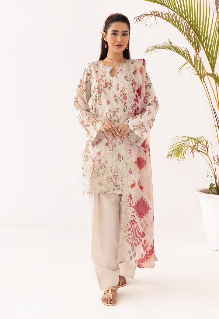 Like moonlight filtering through a blooming orchard, this ensemble radiates gentle elegance and poetic allure. The digital printed schiffli embroidered Cambric shirt is adorned with delicate pink and blush floral motifs, each petal and vine brought to life with intricate cutwork and soft embroidery. Scalloped embroidered borders and fine lace trims accentuate the neckline and border, lending a touch of refined femininity.