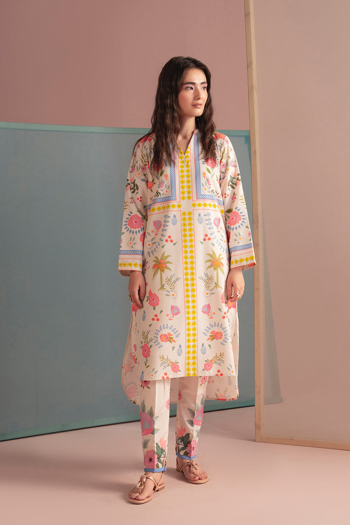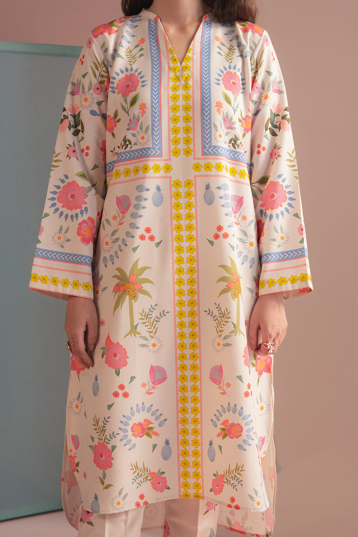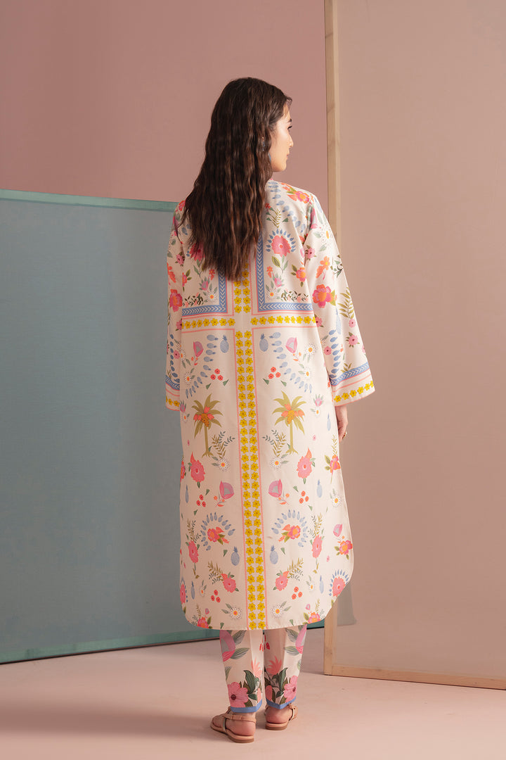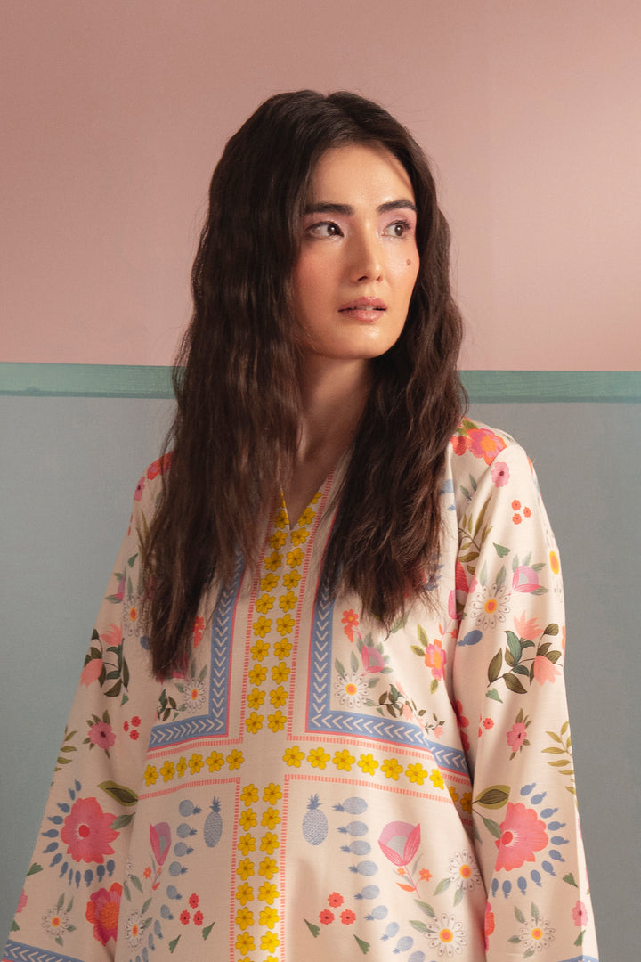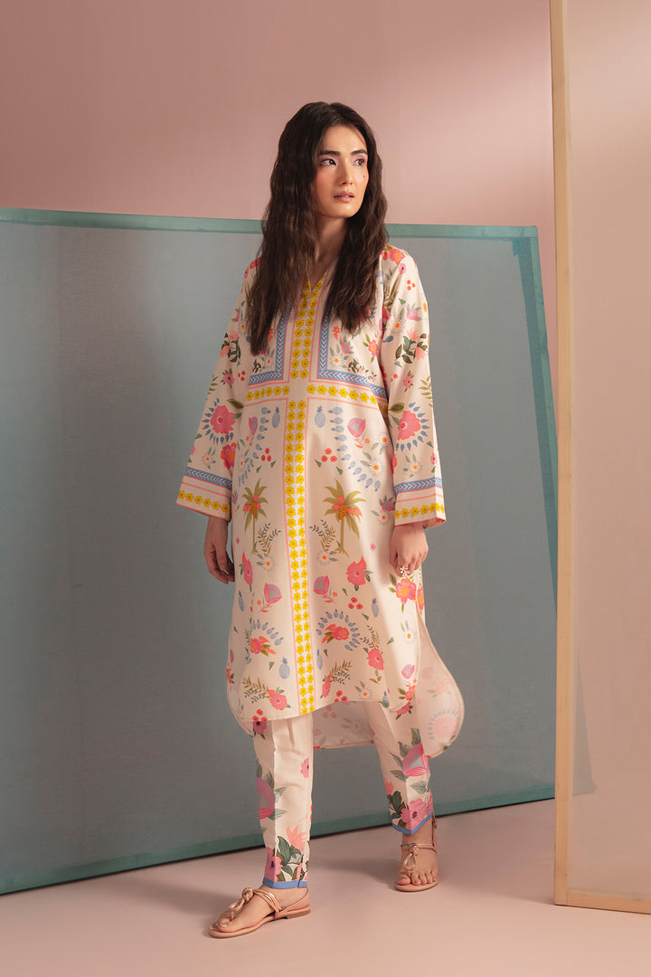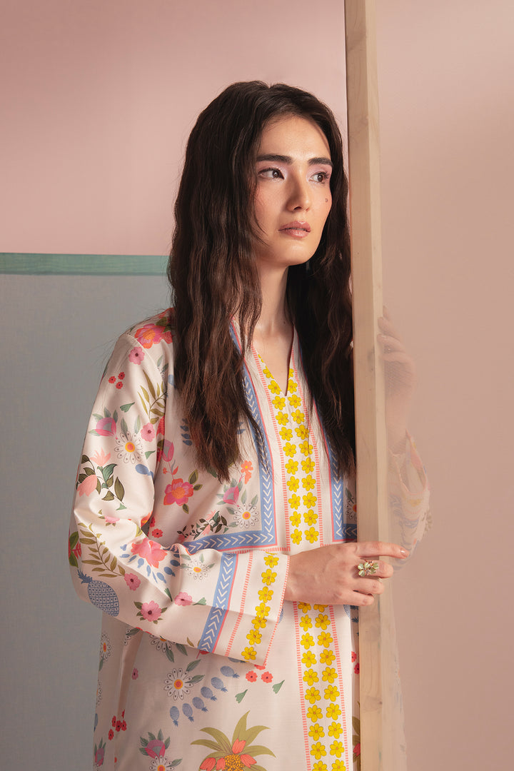 Miraal captures the joyful spirit of fall with its refreshing color palette and lively motifs. Set on an white/ivory base, the shirt features tropical-inspired prints with palm trees, florals, and geometric patterns highlighted by yellow borders. Paired with coordinated pencil trousers, this look brings a youthful and artistic flair — perfect for casual outings or daytime gatherings with a hint of wanderlust charm.