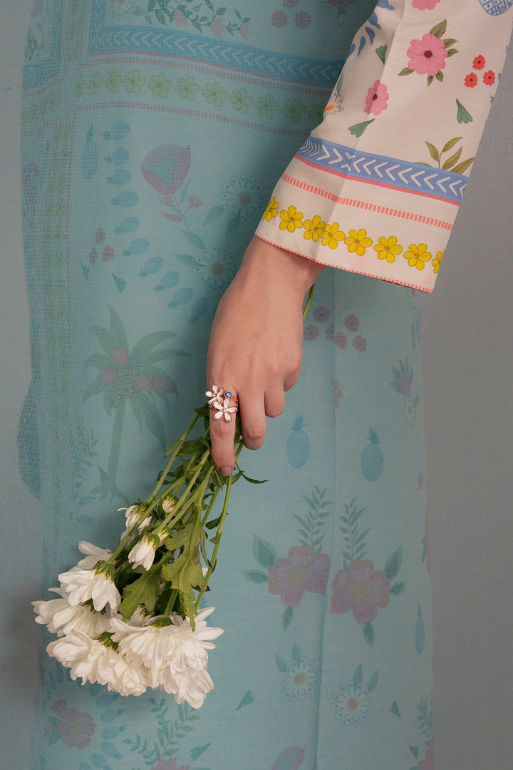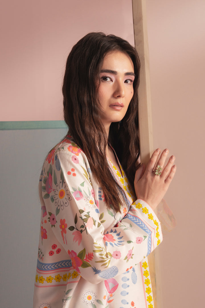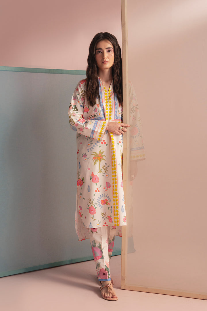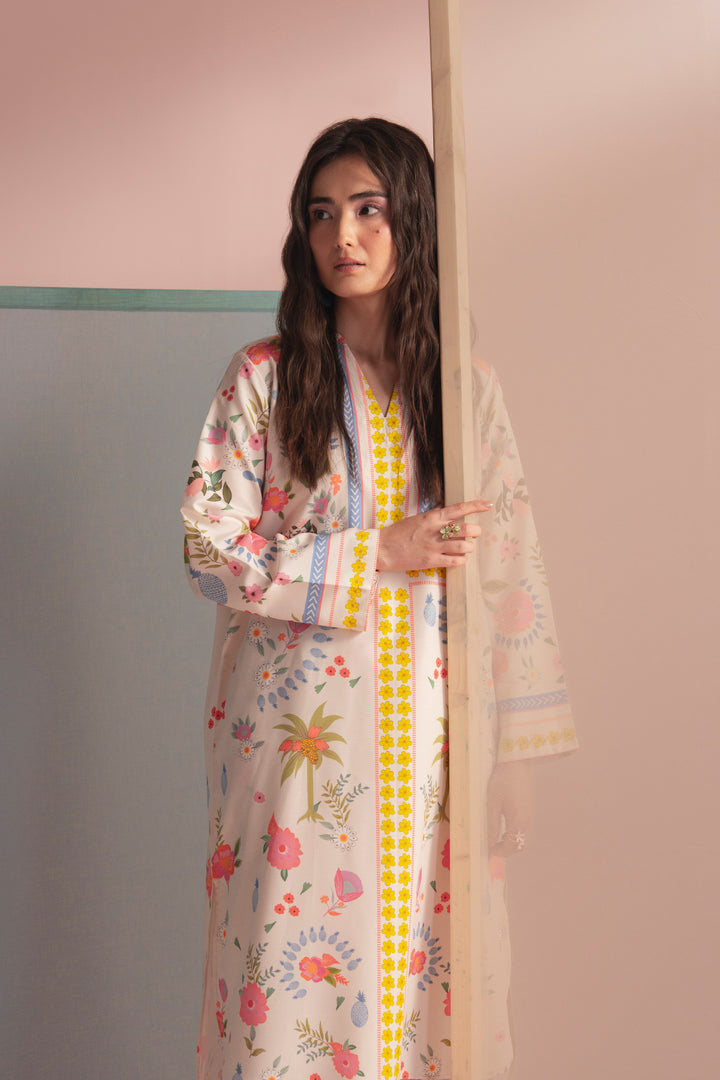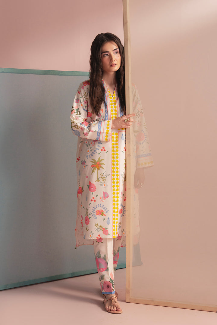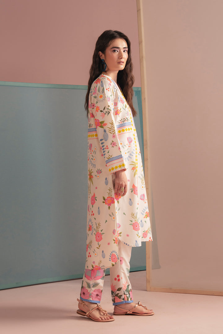 Miraal captures the joyful spirit of fall with its refreshing color palette and lively motifs. Set on an white/ivory base, the shirt features tropical-inspired prints with palm trees, florals, and geometric patterns highlighted by yellow borders. Paired with coordinated pencil trousers, this look brings a youthful and artistic flair — perfect for casual outings or daytime gatherings with a hint of wanderlust charm.