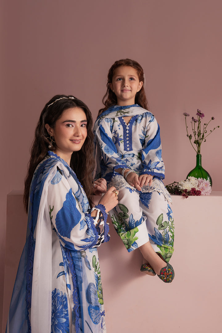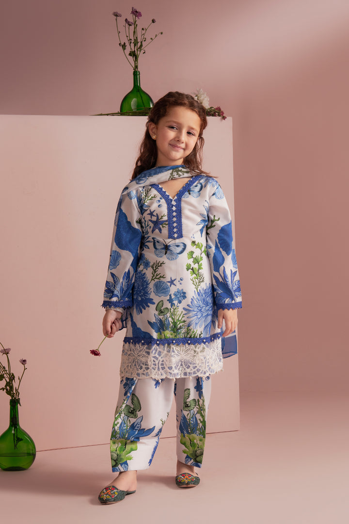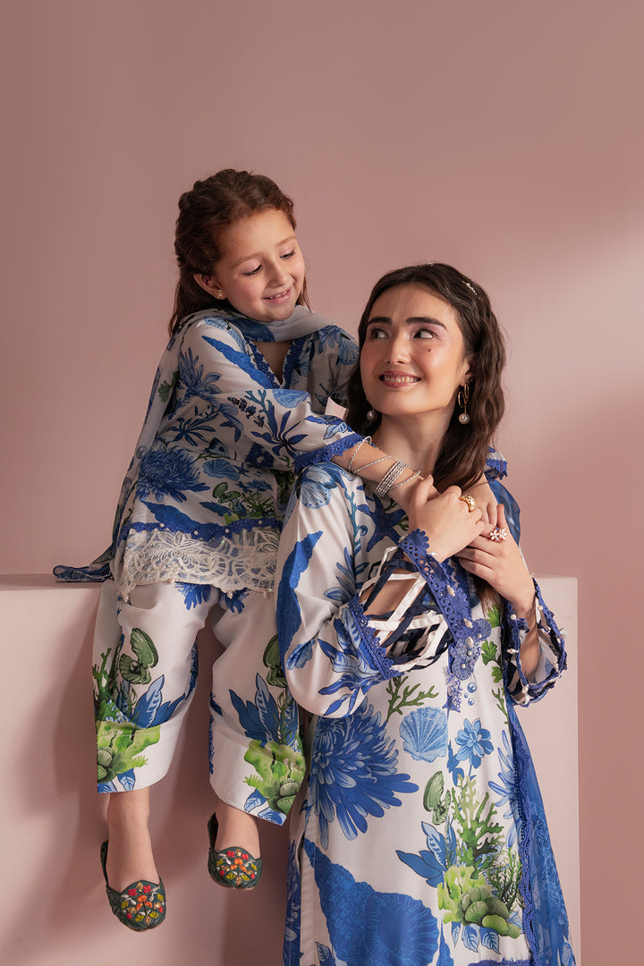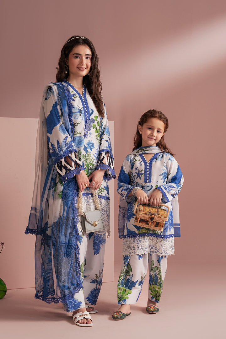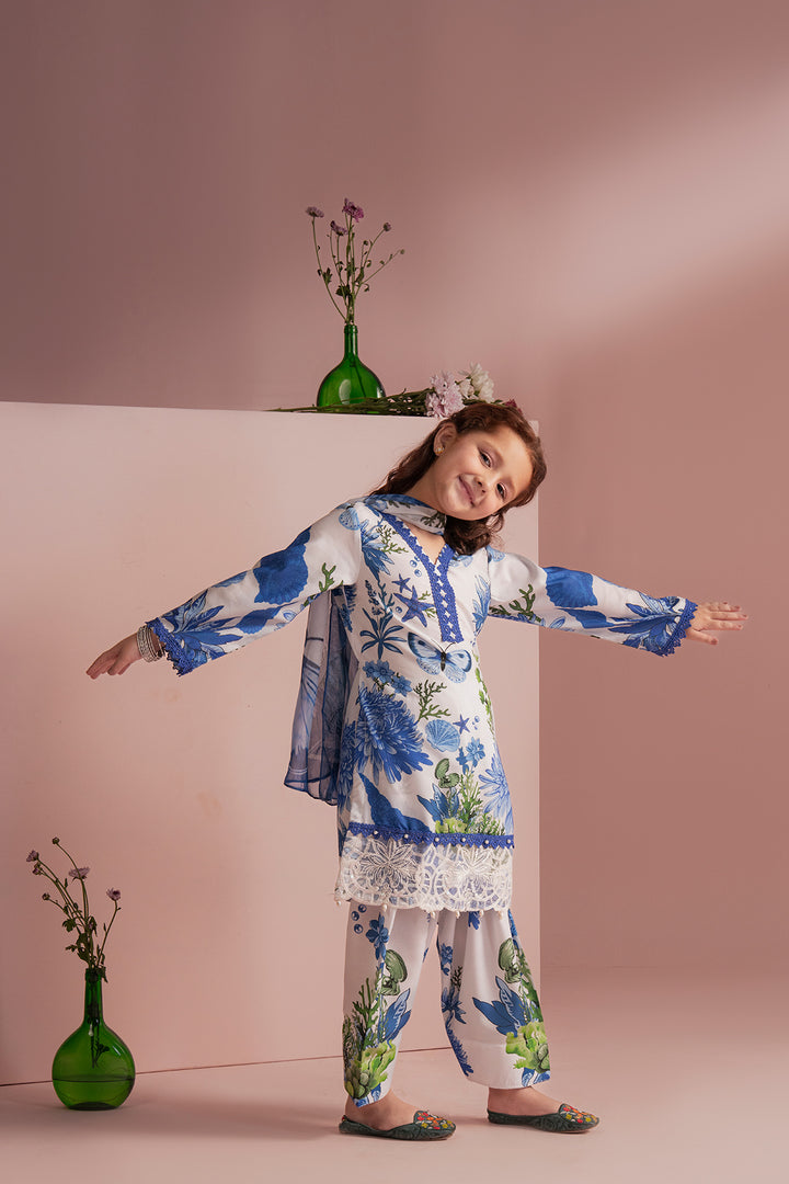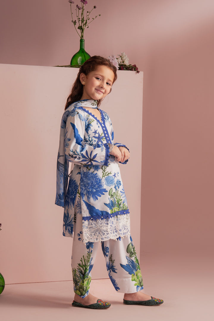 Azure captures the serenity of nature through its rich blue tones and botanical prints. The intricate lace accents on the sleeves and hemline add a refined touch, making it perfect for both daytime sophistication and evening elegance. The look is completed with a flowing chiffon dupatta, adorned with complementary hues that add depth and movement. Perfect for autumn gatherings, cultural festivities, or chic daytime wear, this ensemble captures the essence of effortless grace with a contemporary twist.