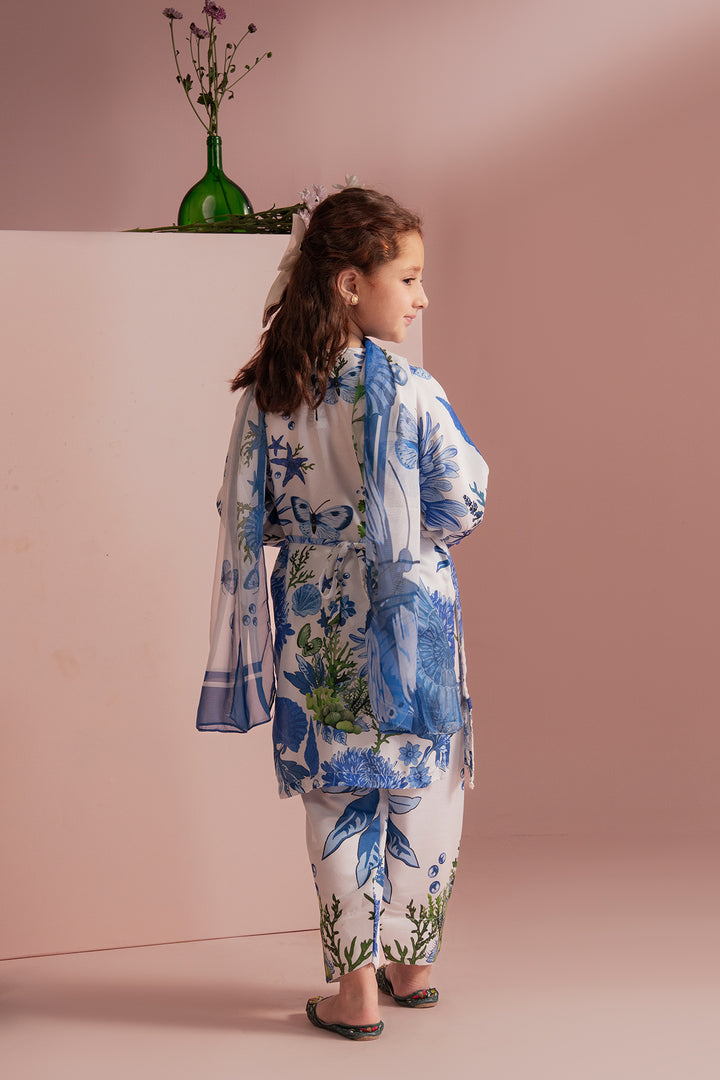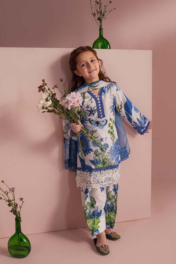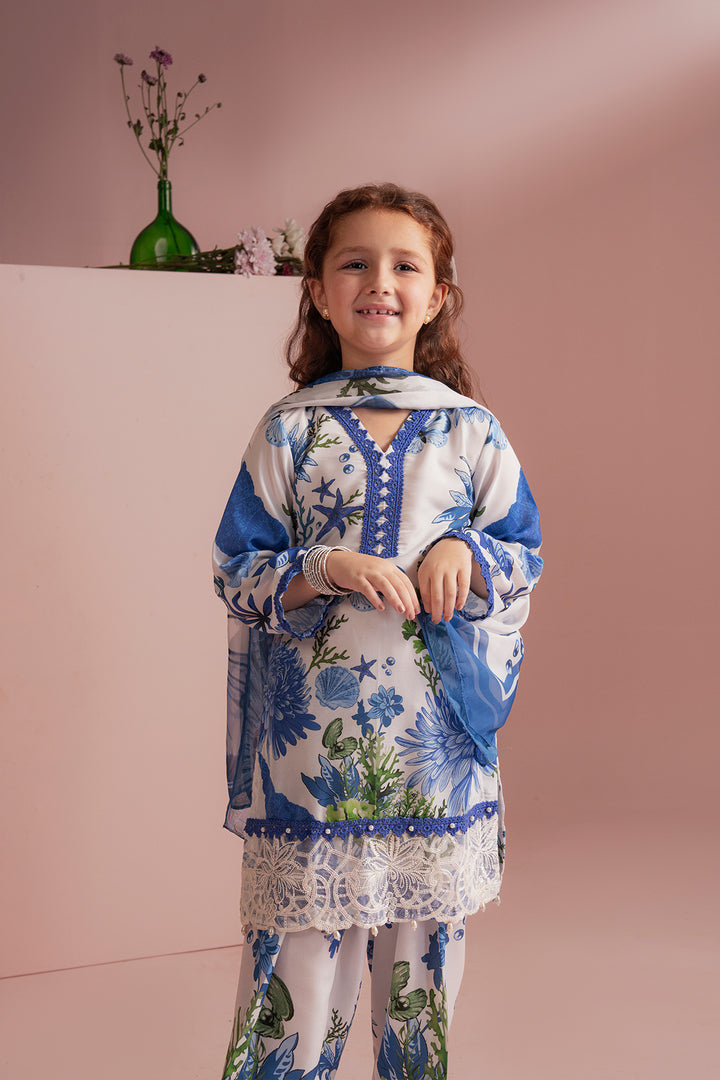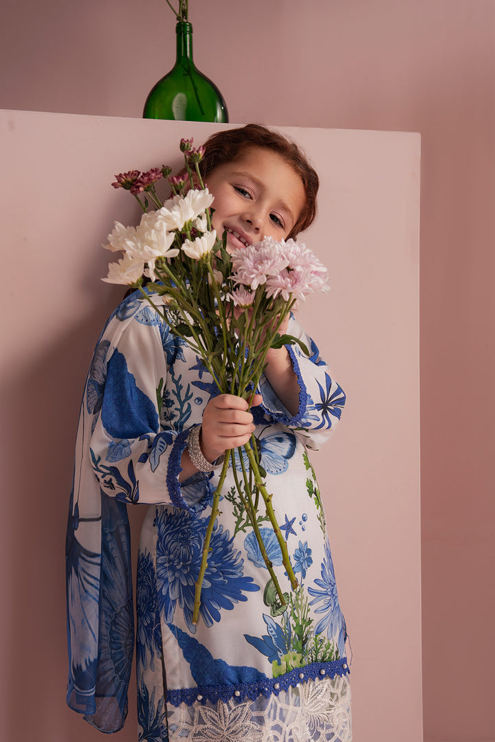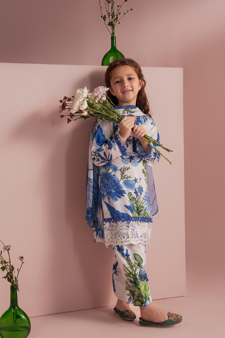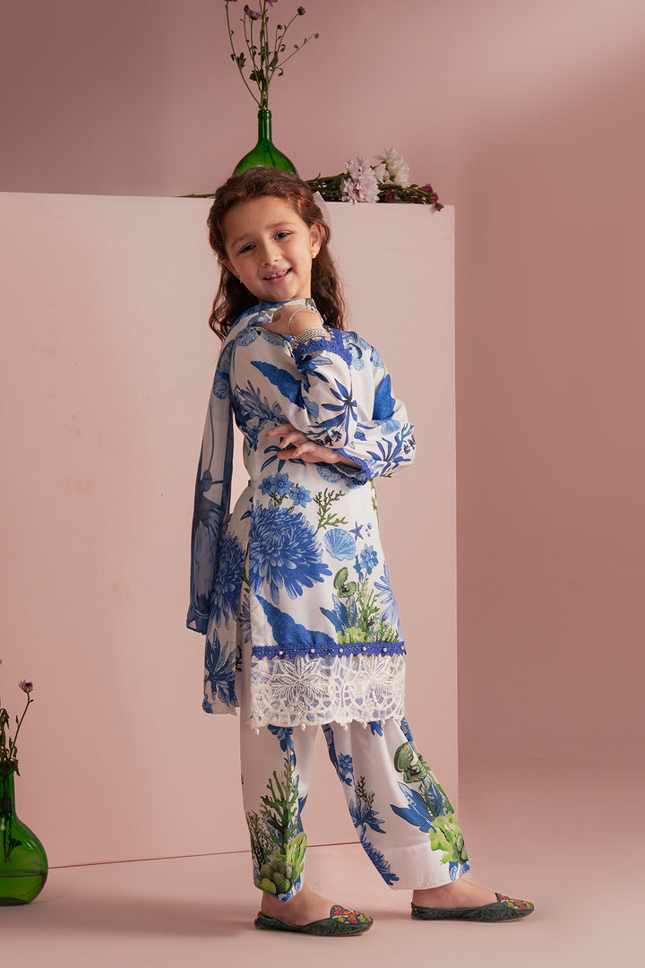 Azure captures the serenity of nature through its rich blue tones and botanical prints. The intricate lace accents on the sleeves and hemline add a refined touch, making it perfect for both daytime sophistication and evening elegance. The look is completed with a flowing chiffon dupatta, adorned with complementary hues that add depth and movement. Perfect for autumn gatherings, cultural festivities, or chic daytime wear, this ensemble captures the essence of effortless grace with a contemporary twist.