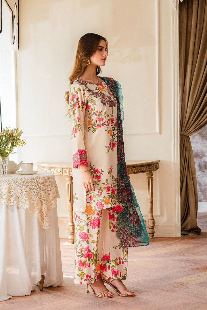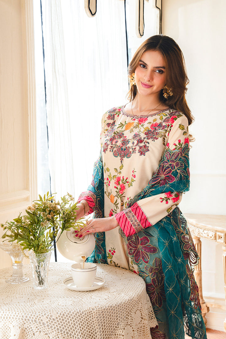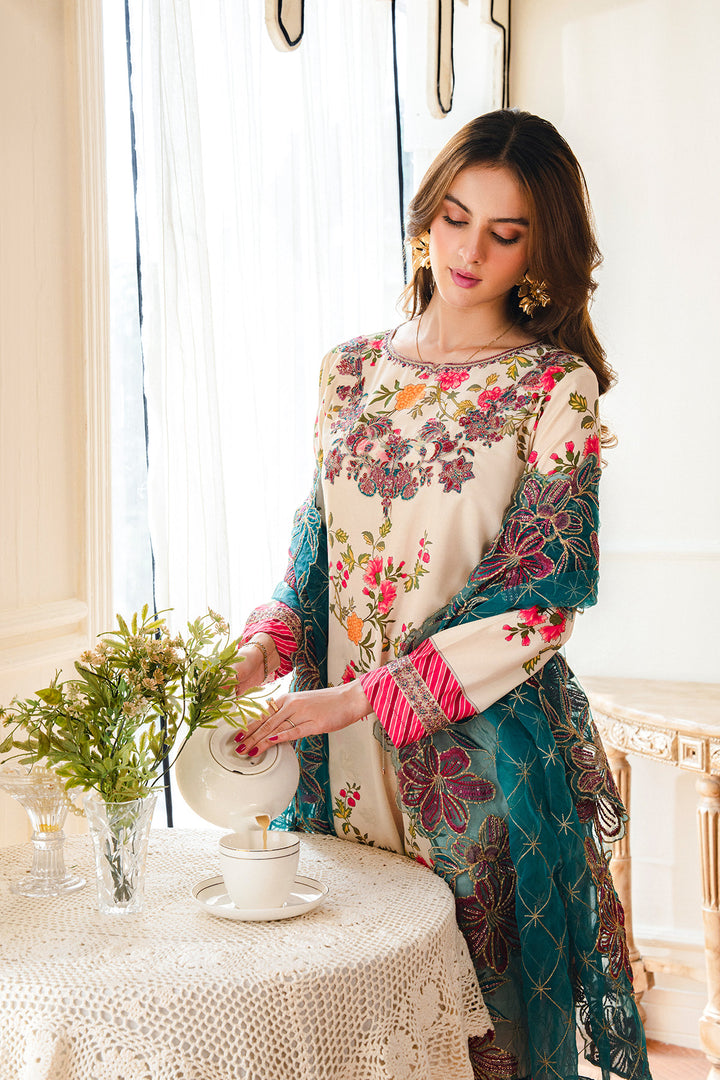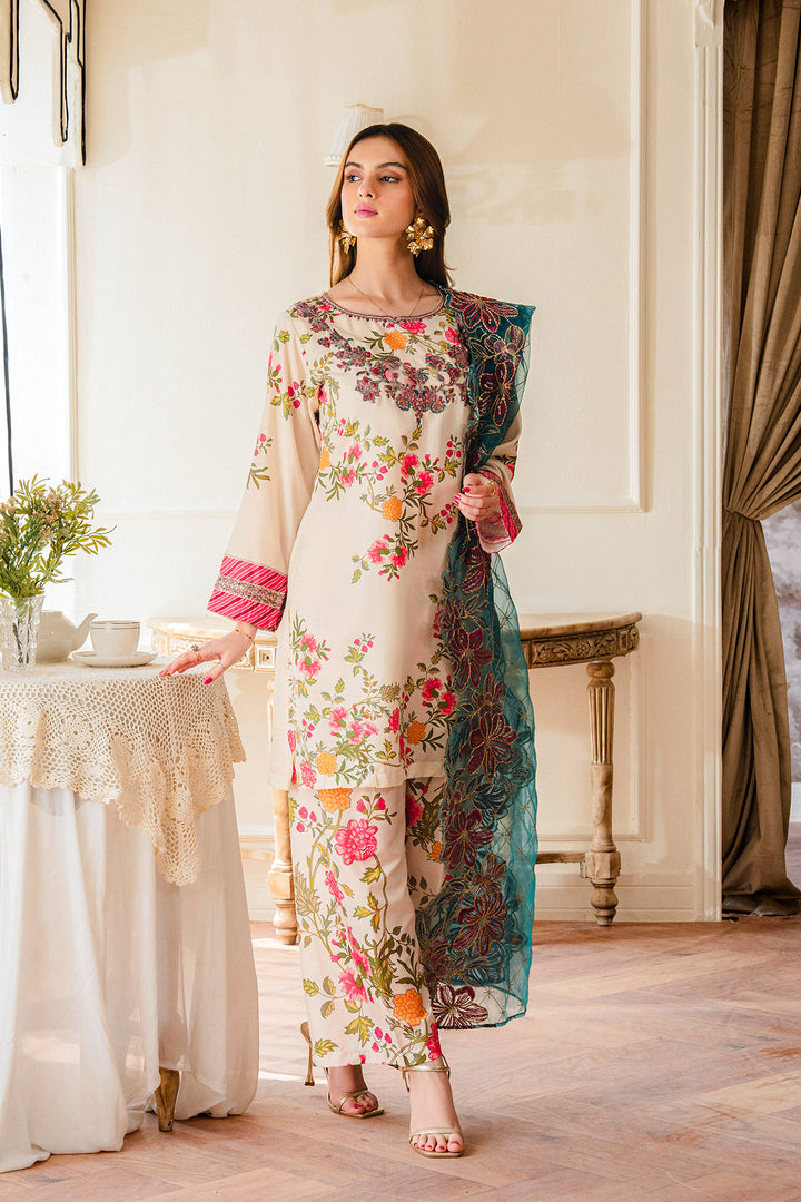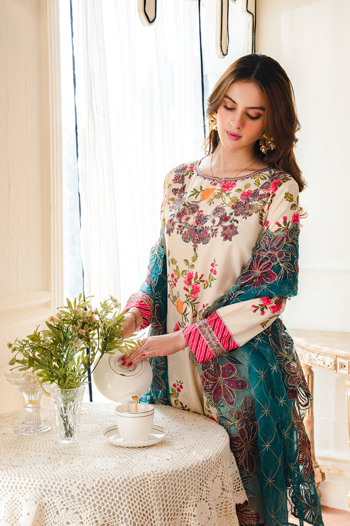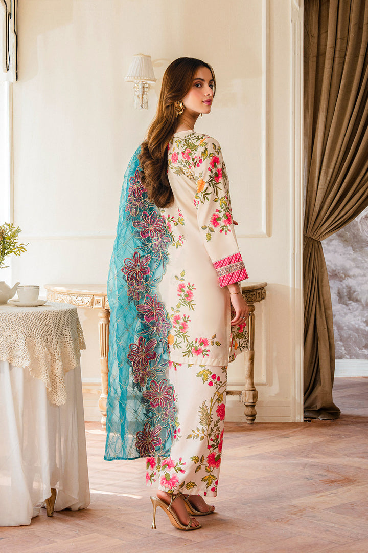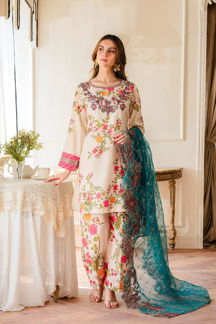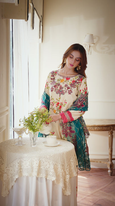 A graceful harmony of creamy off-white with blooming accents of pink, red, and soft green. The base exudes subtle elegance, while the floral tones bring vibrancy and freshness, perfectly balanced with the richness of a teal organza dupatta.