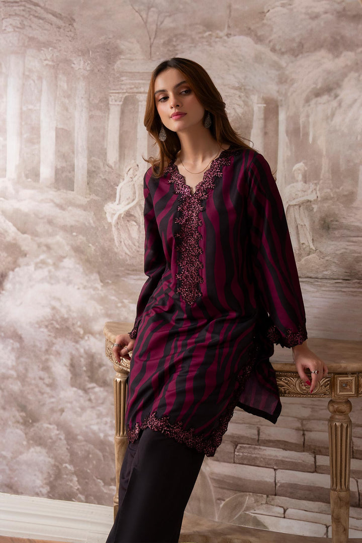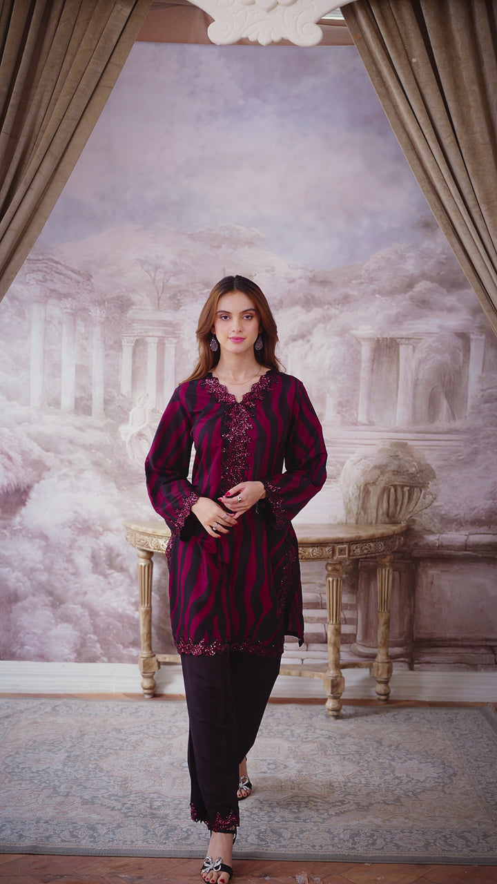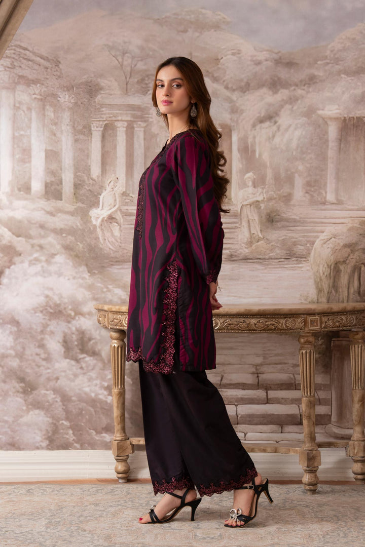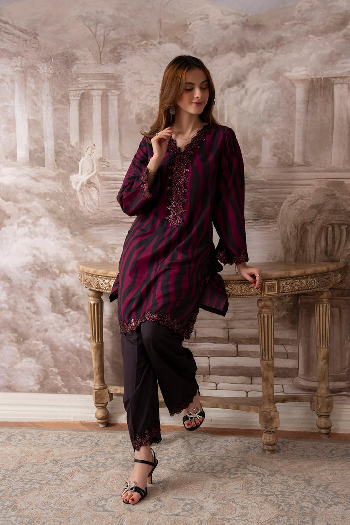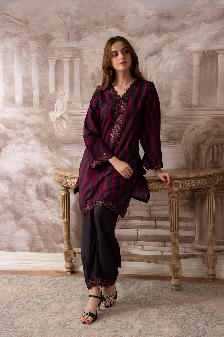 A bold interplay of deep magenta and black, accentuated with fine Sequinz embroidery. The palette is rich, dramatic, and effortlessly chic, perfect for autumn evenings.