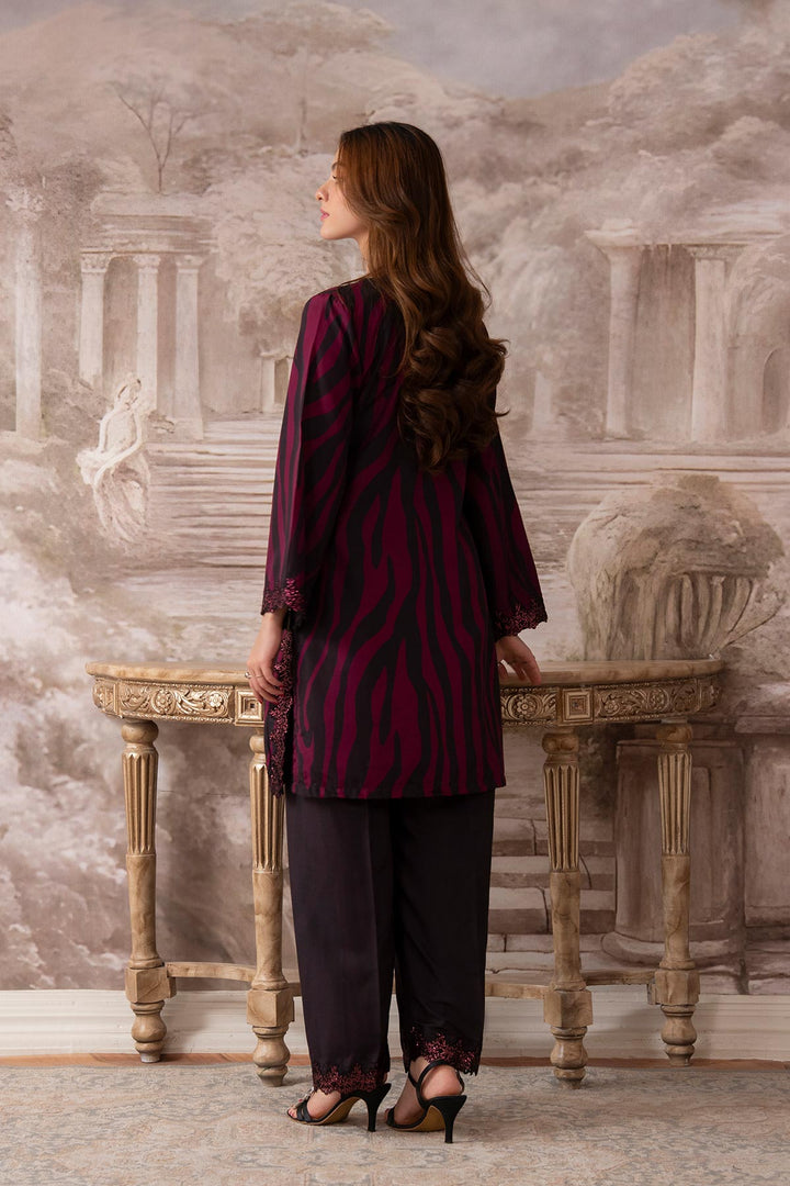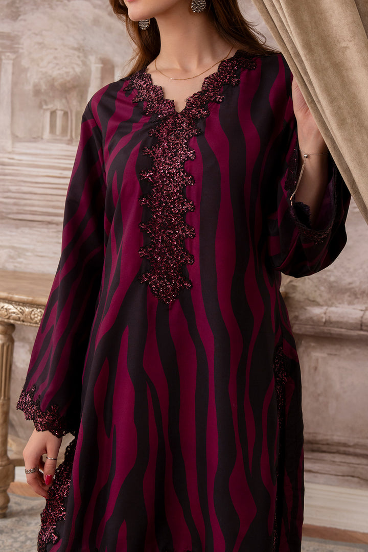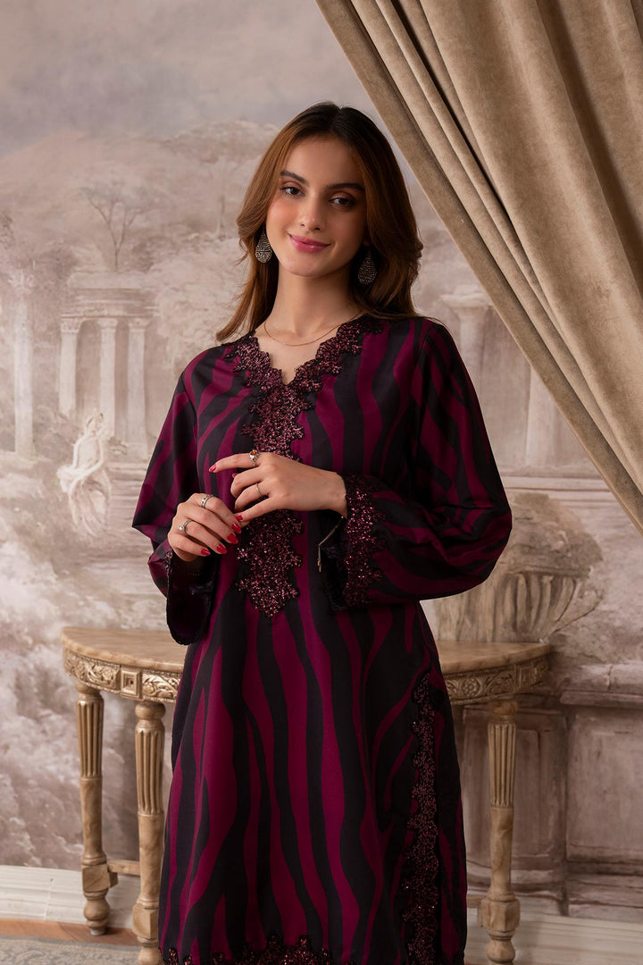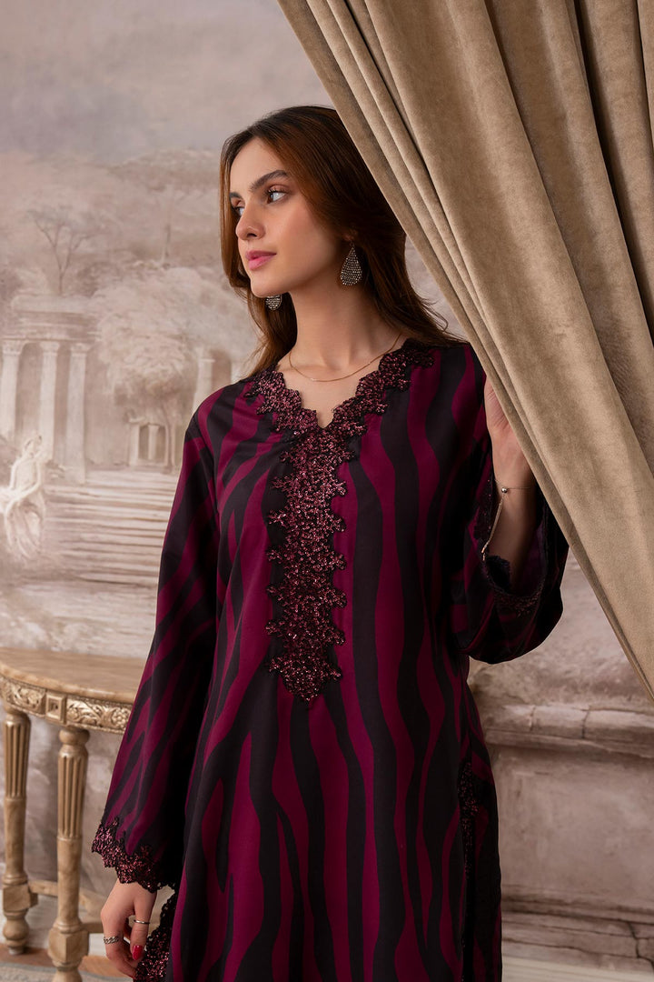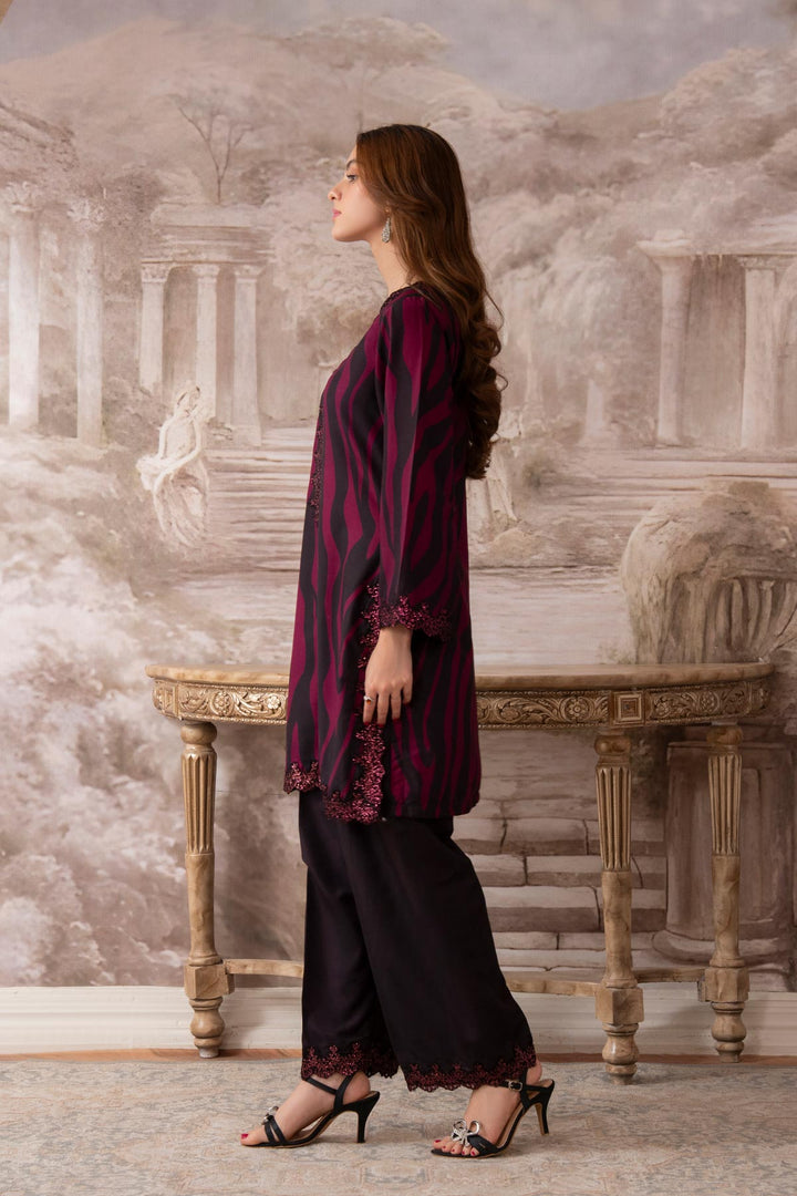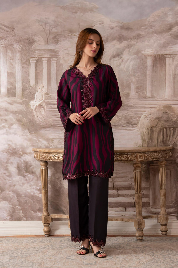 A bold interplay of deep magenta and black, accentuated with fine Sequinz embroidery. The palette is rich, dramatic, and effortlessly chic, perfect for autumn evenings.
