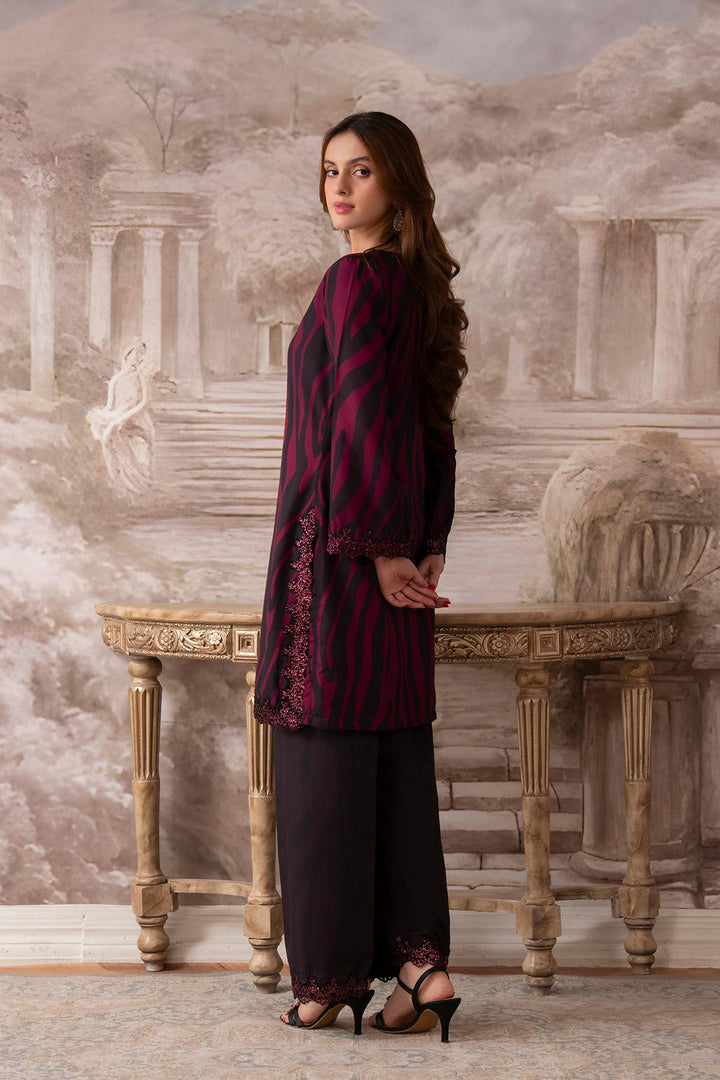 Noir Stripe from Aik Pret’s Arsh Fall ’25 Edit redefines classic elegance with a modern edge. Crafted from Silk Cambric, the striped shirt features a striking magenta-and-black pattern, elevated with delicate Sequinz embroidery that adds texture and refinement. Paired with sleek trousers, the ensemble creates a sophisticated silhouette that is both versatile and statement-making. Designed for women who appreciate bold minimalism, this outfit transitions seamlessly from refined daywear to evening sophistication.