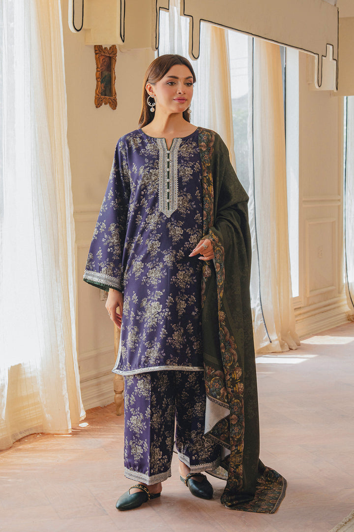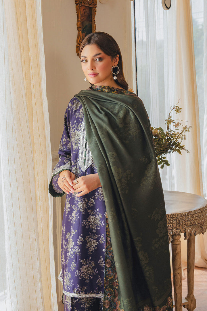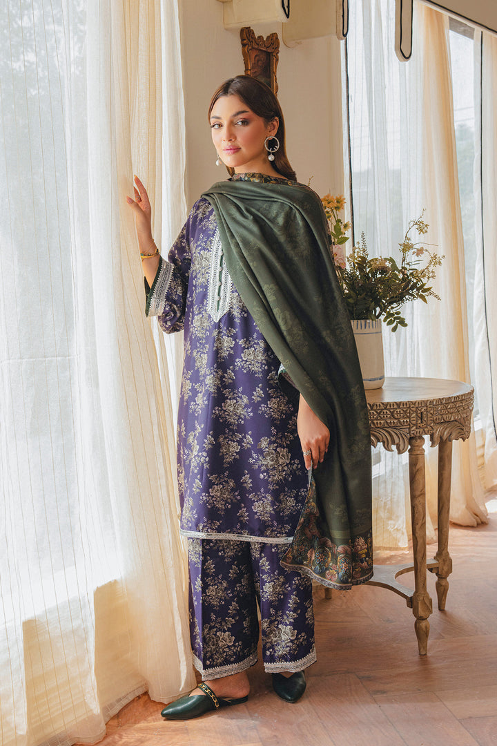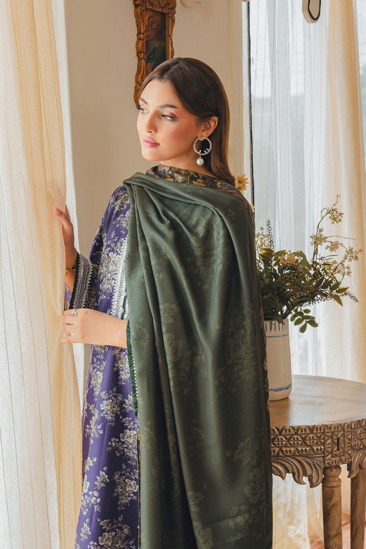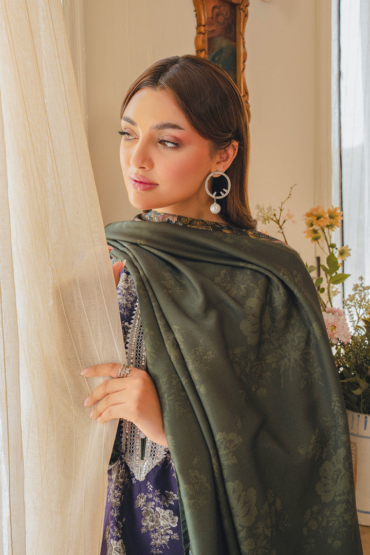 Parizae from Aik Pret’s Arsh Fall ’25 Edit is a graceful blend of tradition and modern sophistication. The Twill Khaddar shirt and trouser feature intricate motifs in purple and white, enhanced with lace detailing and elegant button accents. Draped with a dark green herringbone shawl, the look exudes understated luxury, offering both warmth and style for the season. Perfect for autumn evenings and festive gatherings, this ensemble embodies timeless charm with a contemporary edge.