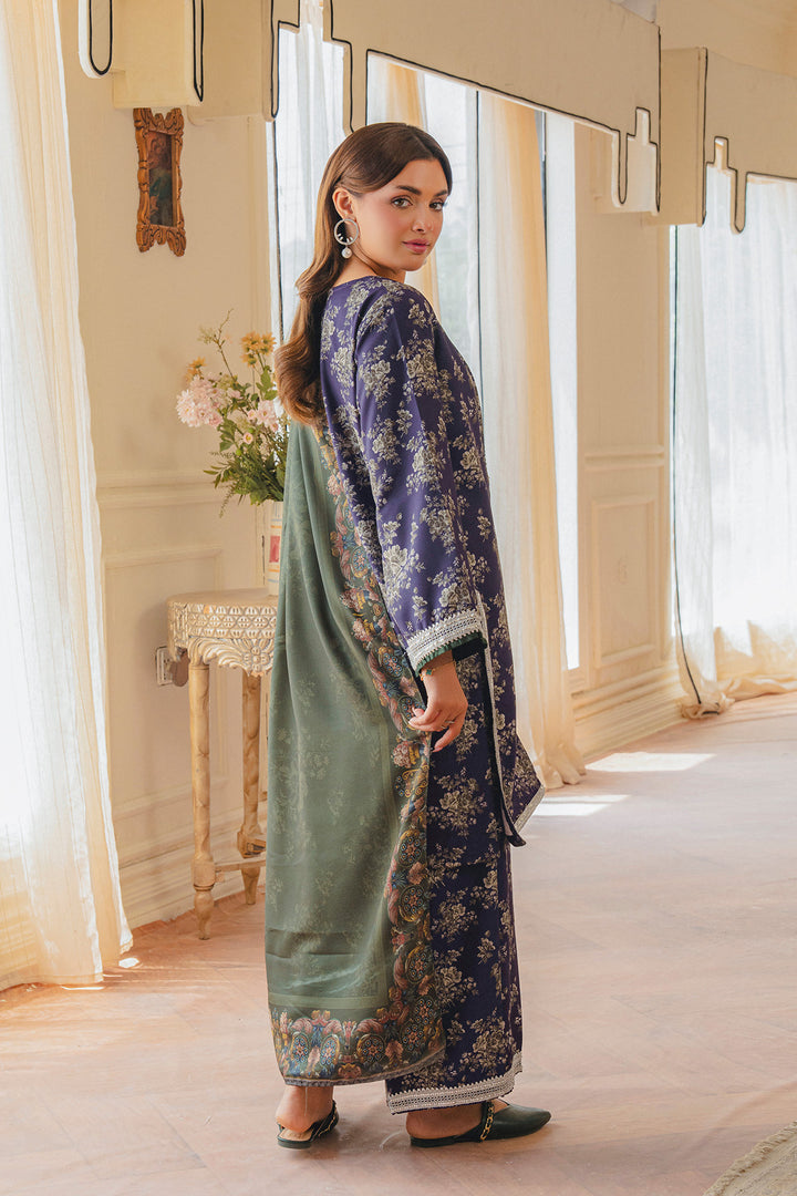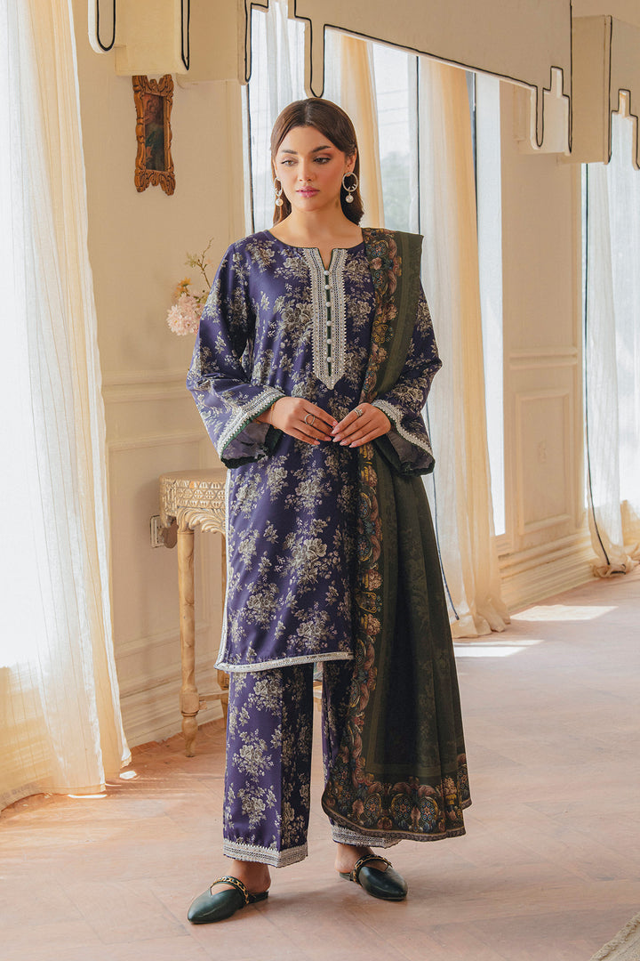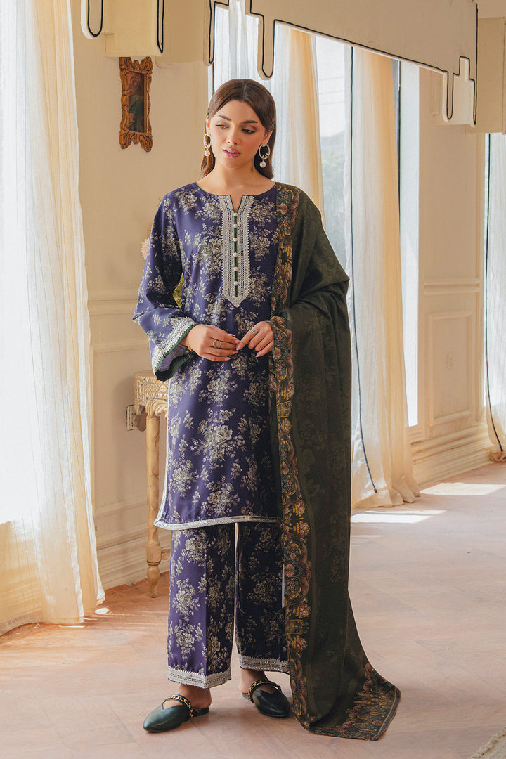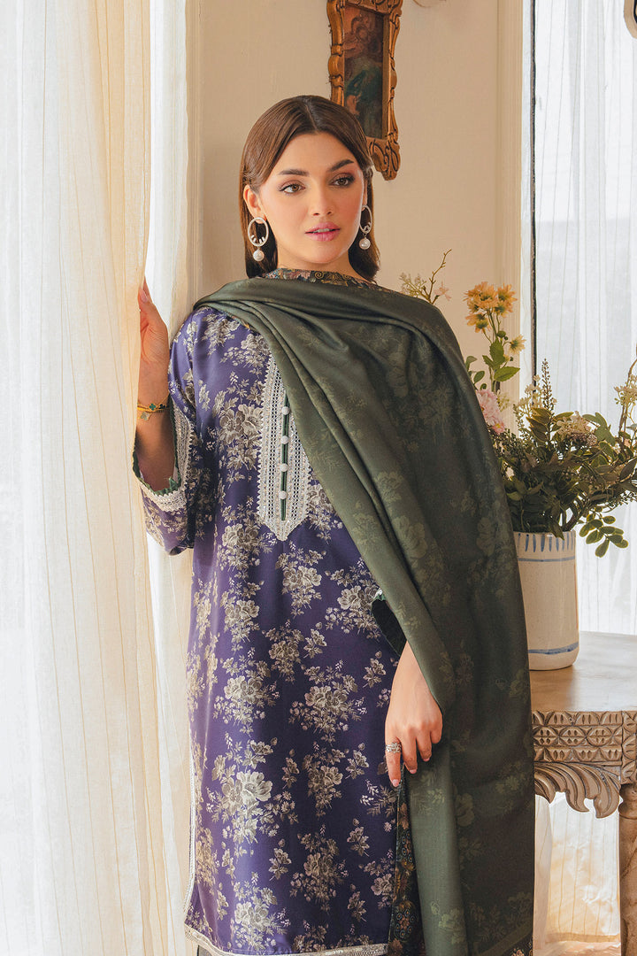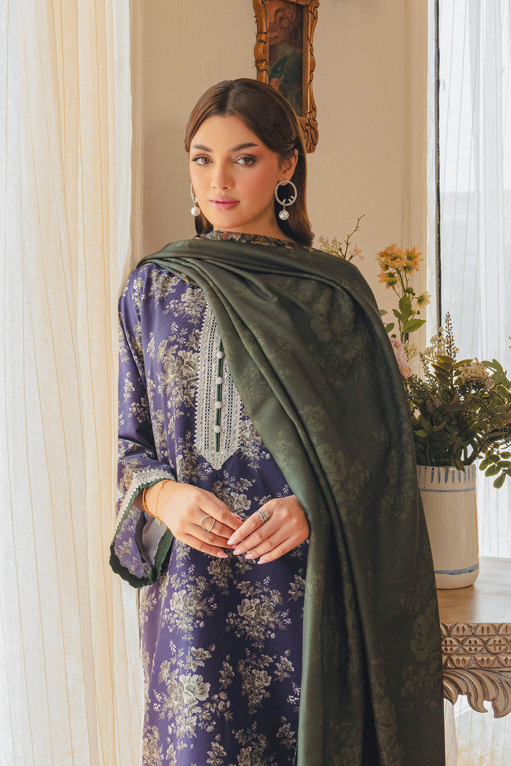 Parizae from Aik Pret’s Arsh Fall ’25 Edit is a graceful blend of tradition and modern sophistication. The Twill Khaddar shirt and trouser feature intricate motifs in purple and white, enhanced with lace detailing and elegant button accents. Draped with a dark green herringbone shawl, the look exudes understated luxury, offering both warmth and style for the season. Perfect for autumn evenings and festive gatherings, this ensemble embodies timeless charm with a contemporary edge.