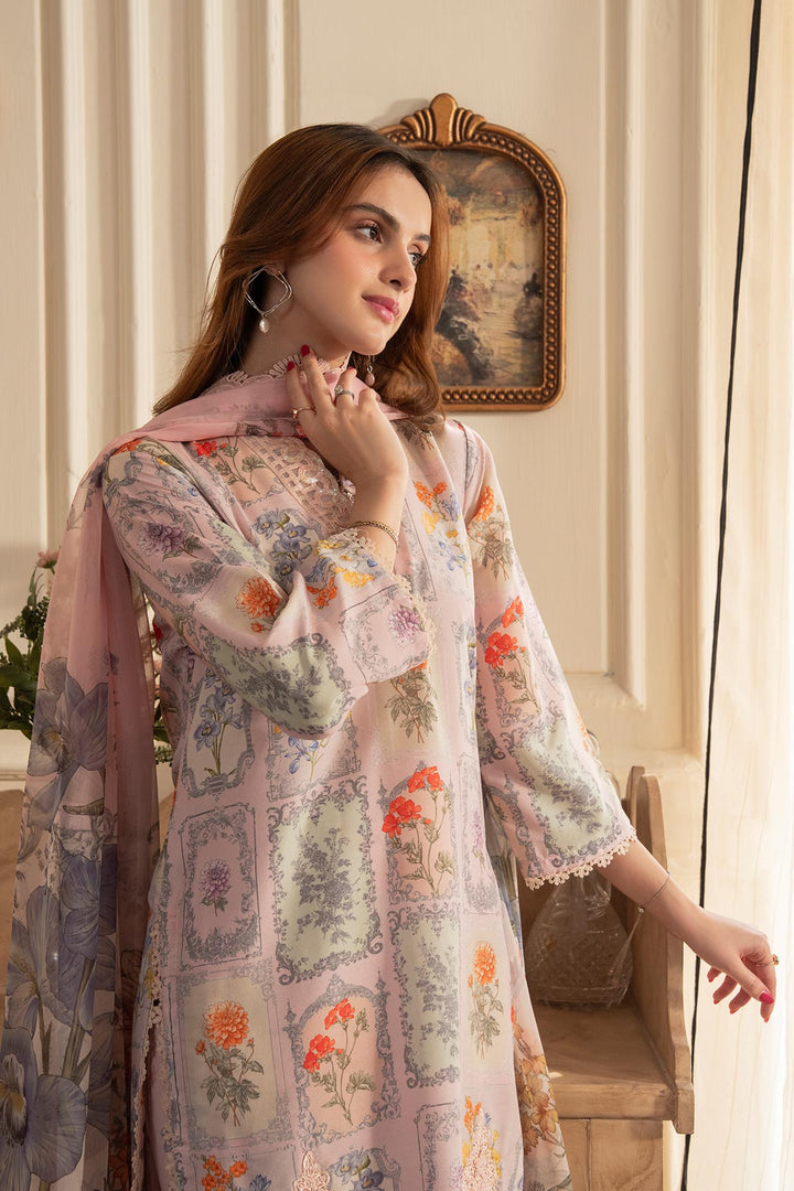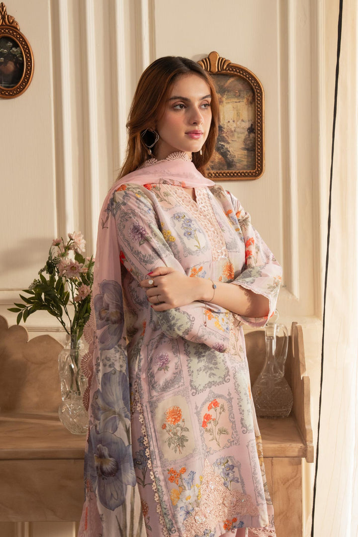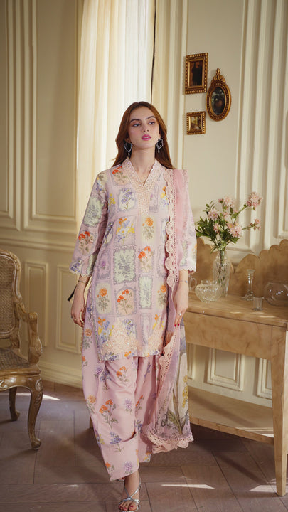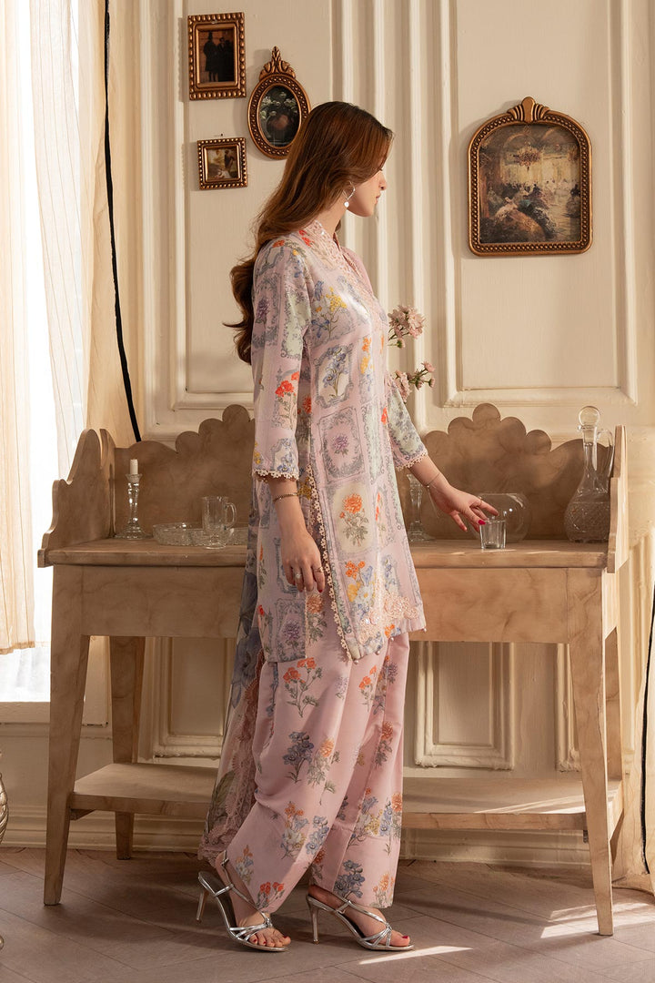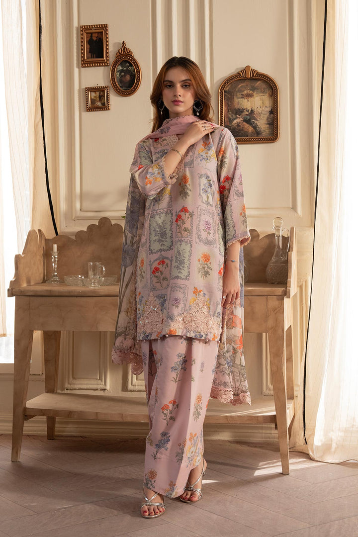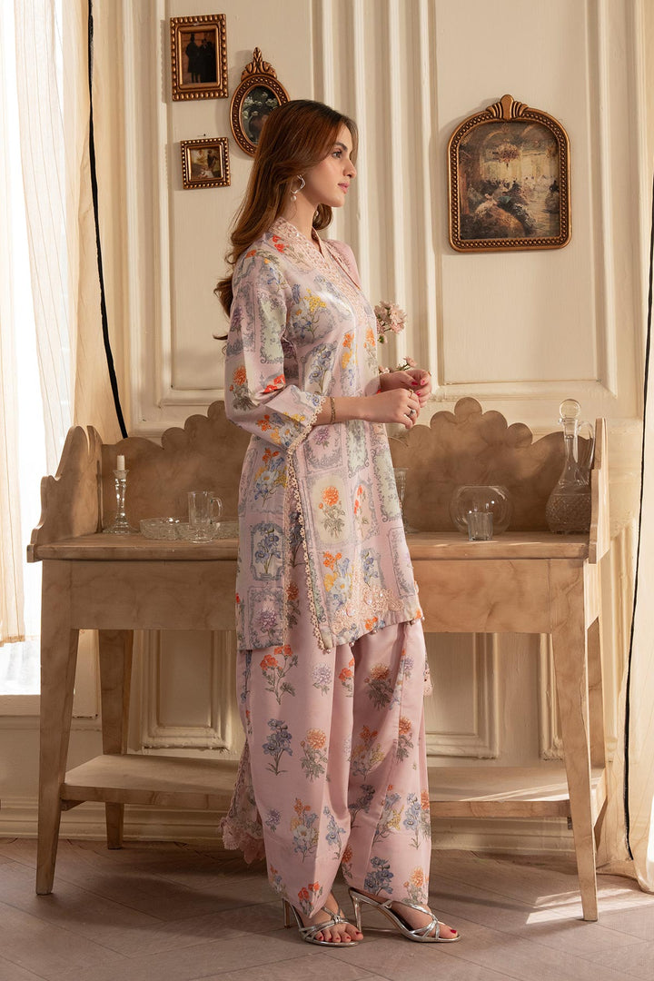 Petal Pastel from Aik Pret’s Arsh Fall ’25 Edit is a graceful ode to understated elegance. Crafted from Silk Cambric, the shirt features intricate lace detailing, paired with farshi shalwar for a modern, flowing silhouette. The look is completed with a lightweight chiffon dupatta, adorned with complementary pastel accents that add movement and charm. Ideal for autumn gatherings, festive occasions, or refined daywear, this ensemble captures the essence of contemporary femininity with timeless appeal.