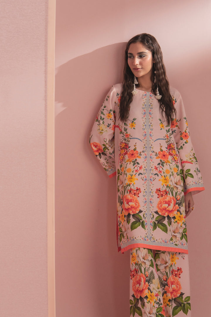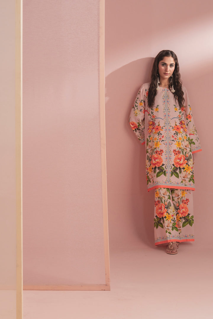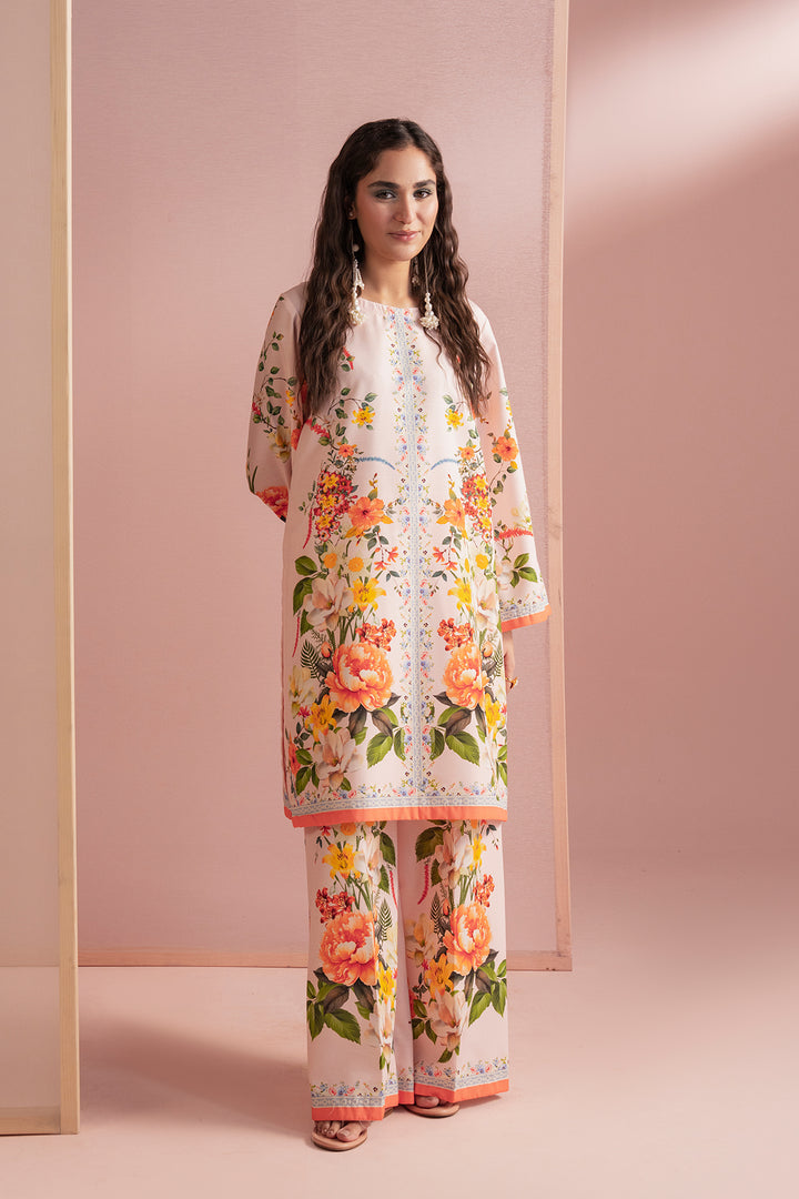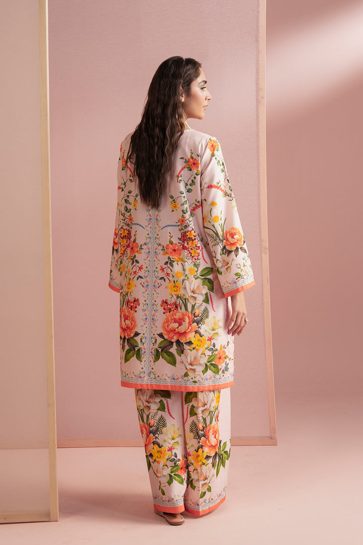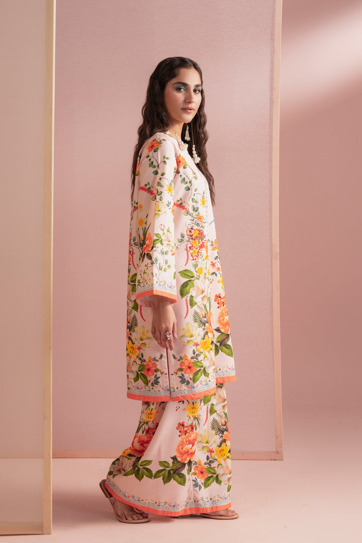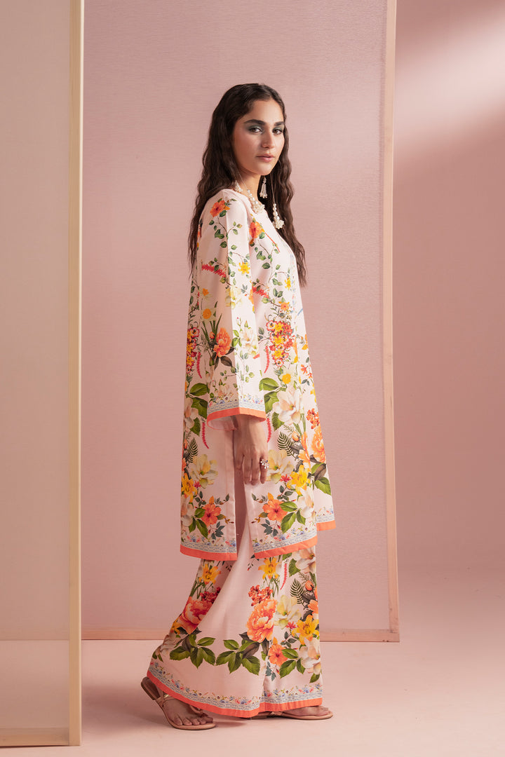 Ranaa radiates feminine elegance with its soft peach base beautifully adorned with blooming orange and green floral patterns. The long, straight-cut shirt paired with coordinated wide-leg trousers creates a harmonious, flowy silhouette. Vibrant yet refined, this look is a celebration of color and comfort — perfect for bright daytime wear and graceful seasonal styling.