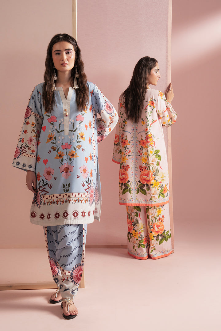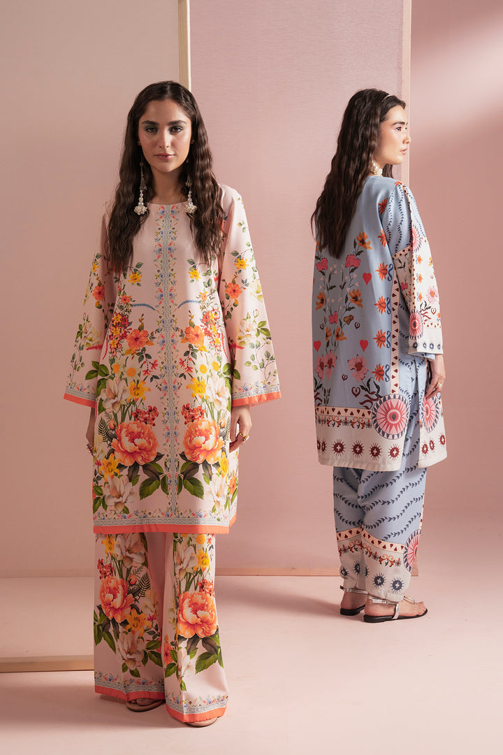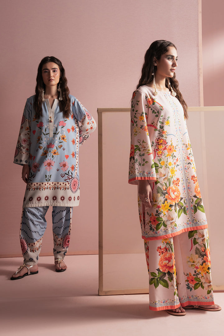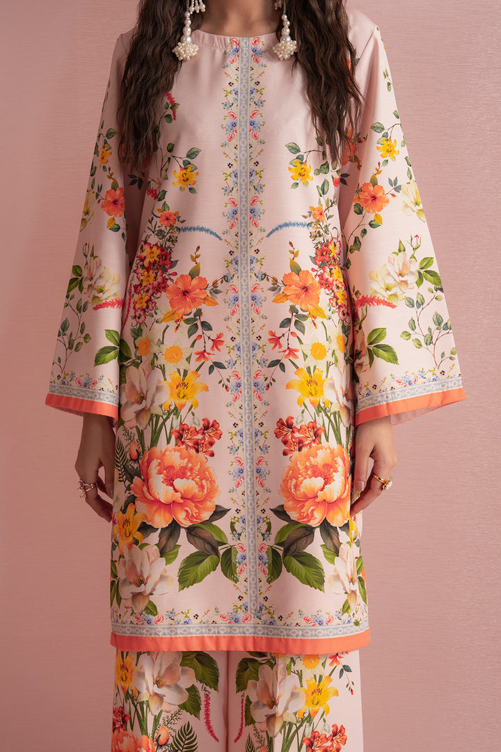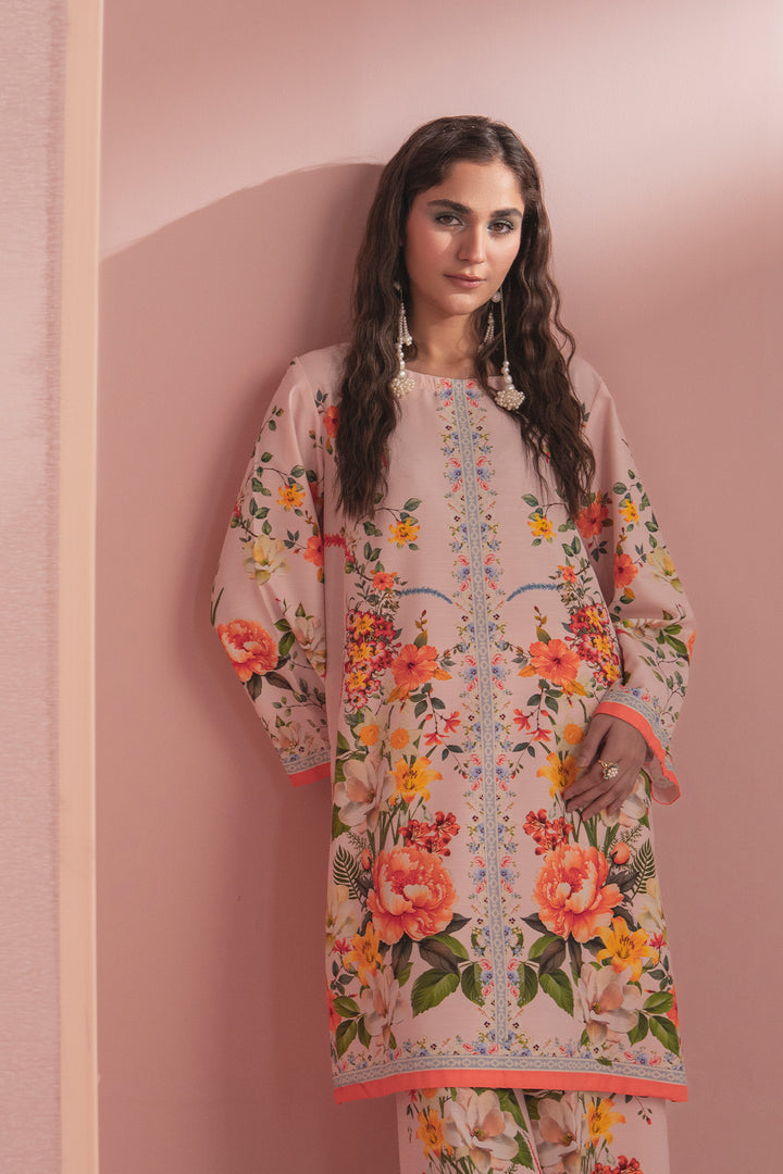 Ranaa radiates feminine elegance with its soft peach base beautifully adorned with blooming orange and green floral patterns. The long, straight-cut shirt paired with coordinated wide-leg trousers creates a harmonious, flowy silhouette. Vibrant yet refined, this look is a celebration of color and comfort — perfect for bright daytime wear and graceful seasonal styling.