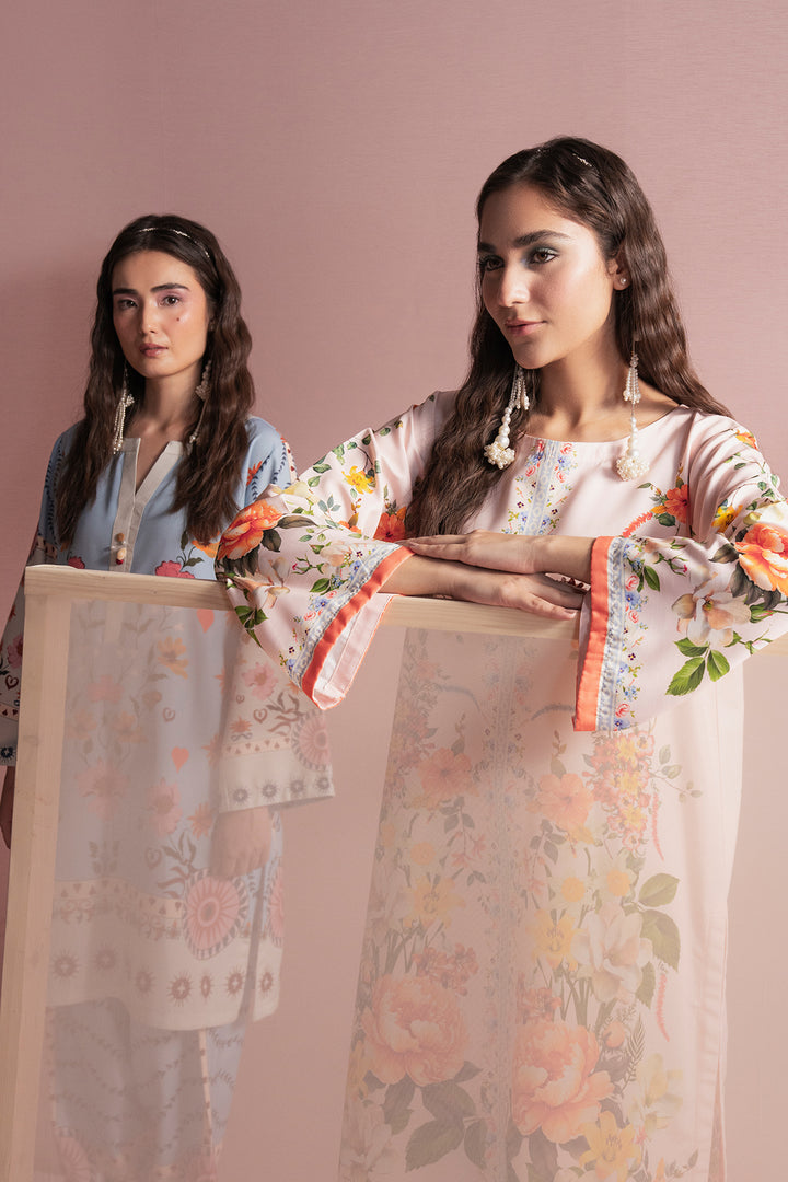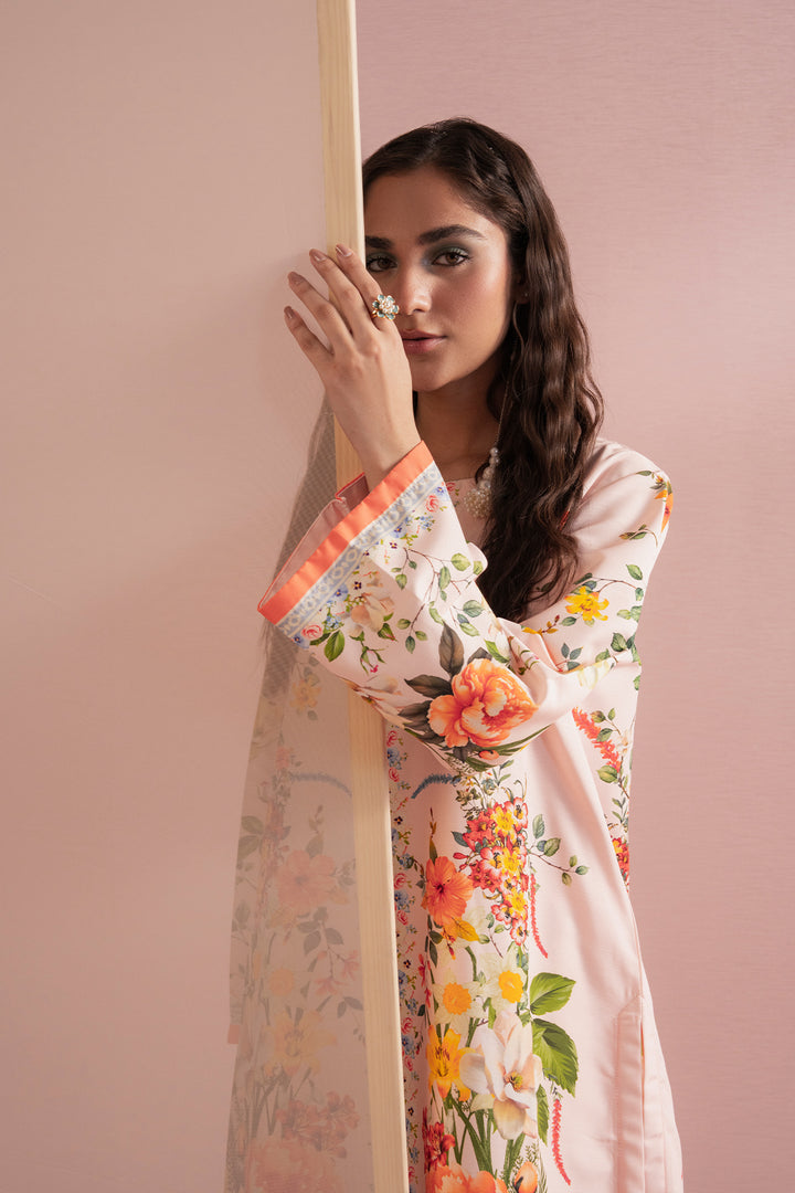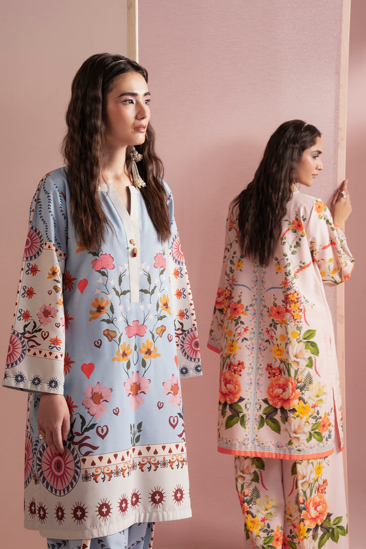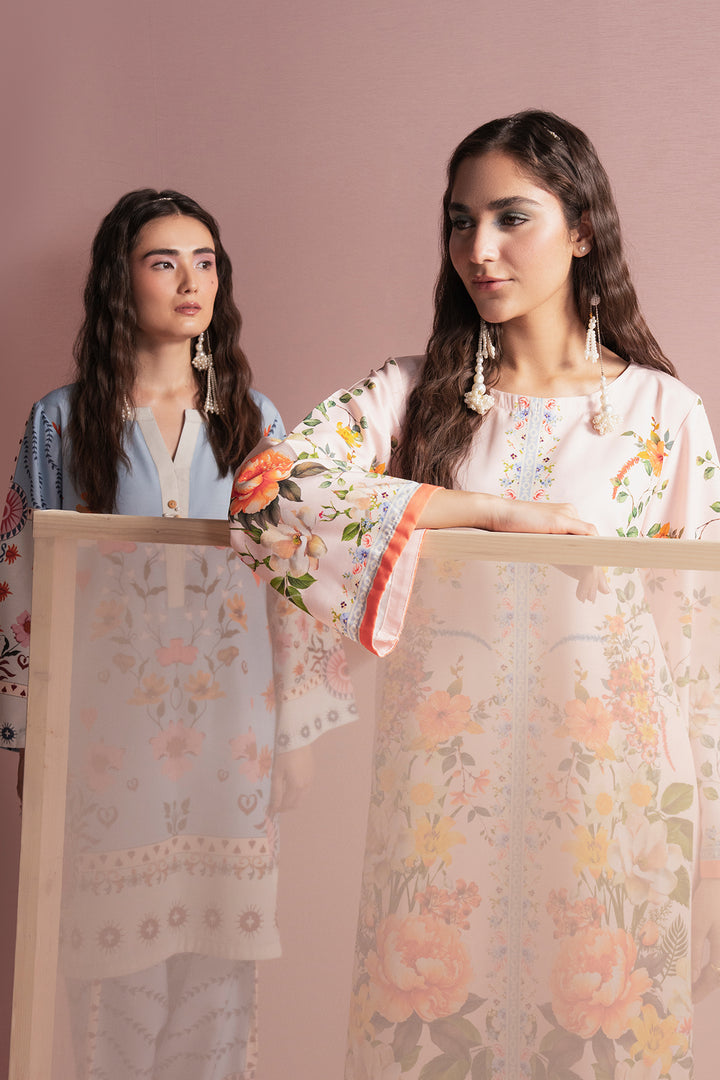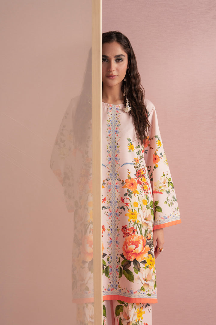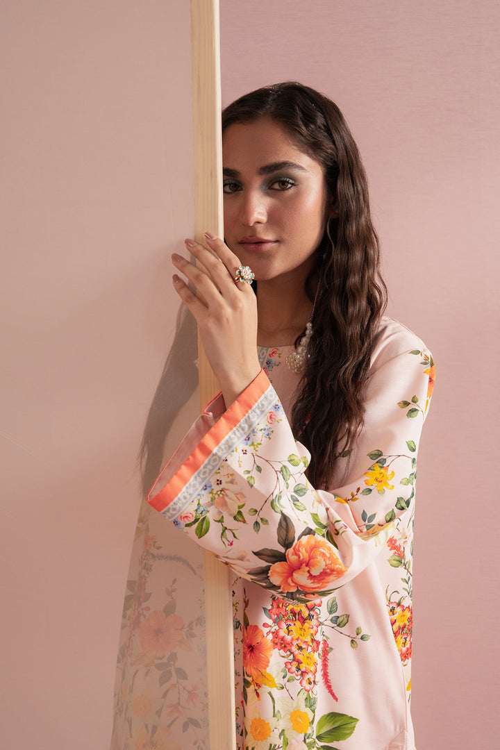 Ranaa radiates feminine elegance with its soft peach base beautifully adorned with blooming orange and green floral patterns. The long, straight-cut shirt paired with coordinated wide-leg trousers creates a harmonious, flowy silhouette. Vibrant yet refined, this look is a celebration of color and comfort — perfect for bright daytime wear and graceful seasonal styling.