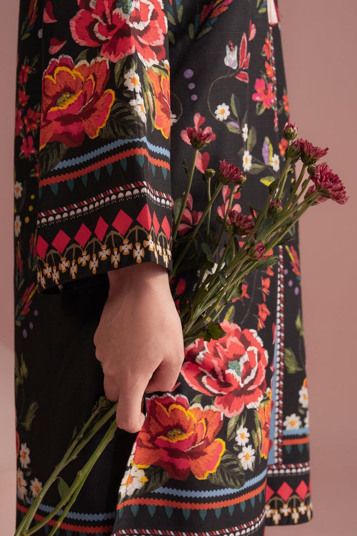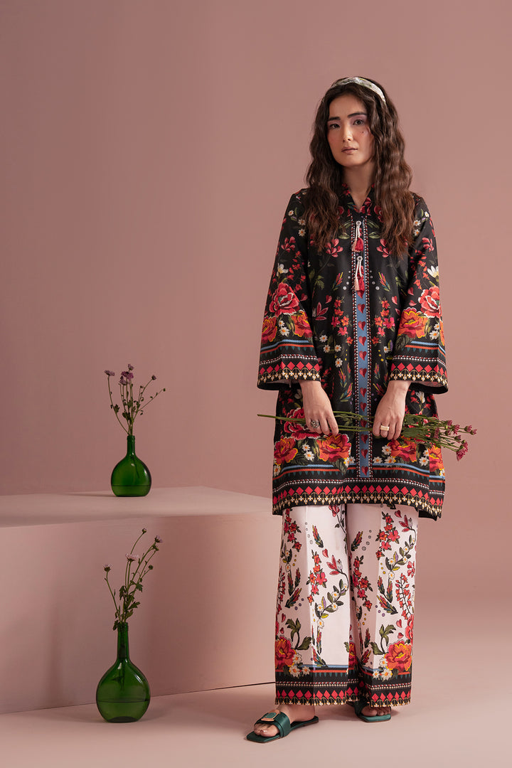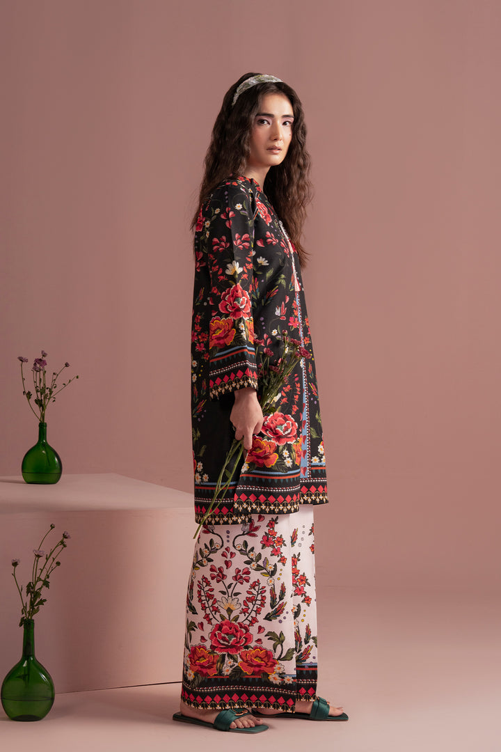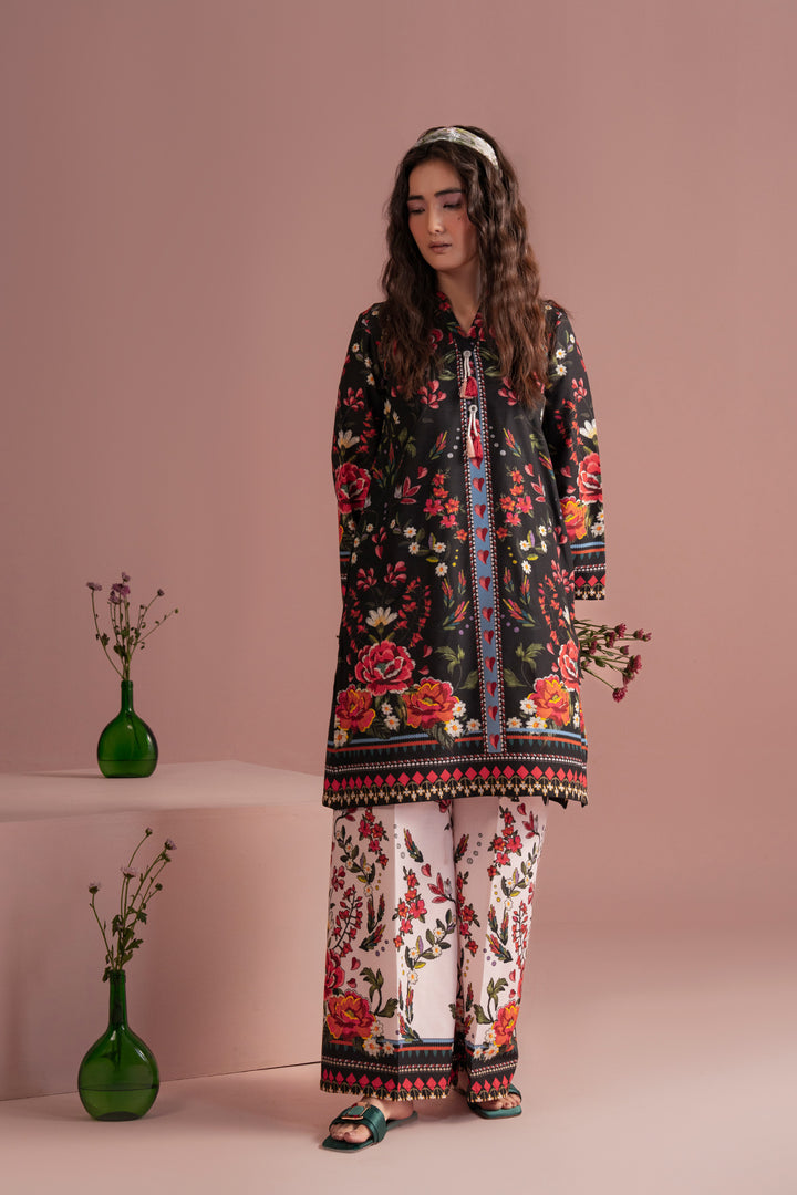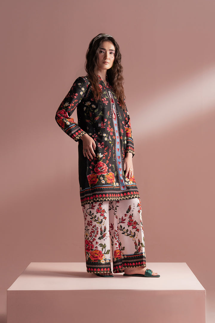 Rohma captures the essence of fall with its striking contrast and vivid florals. The black shirt is embellished with lush red and yellow botanical prints framed by intricate geometric borders. Paired with wide-legged trousers showcasing a complementary floral pattern, this ensemble is both daring and elegant — a perfect choice for those who love statement-making sophistication with an artistic edge.
