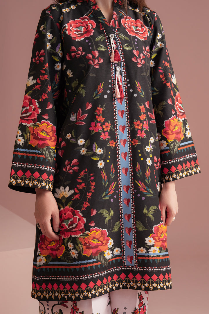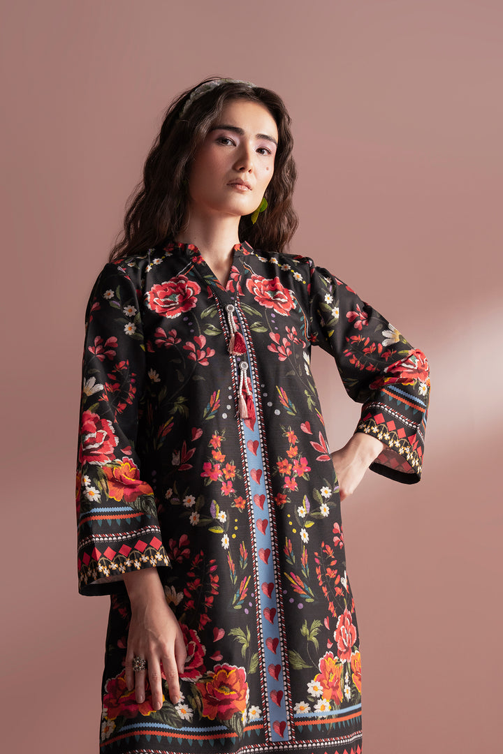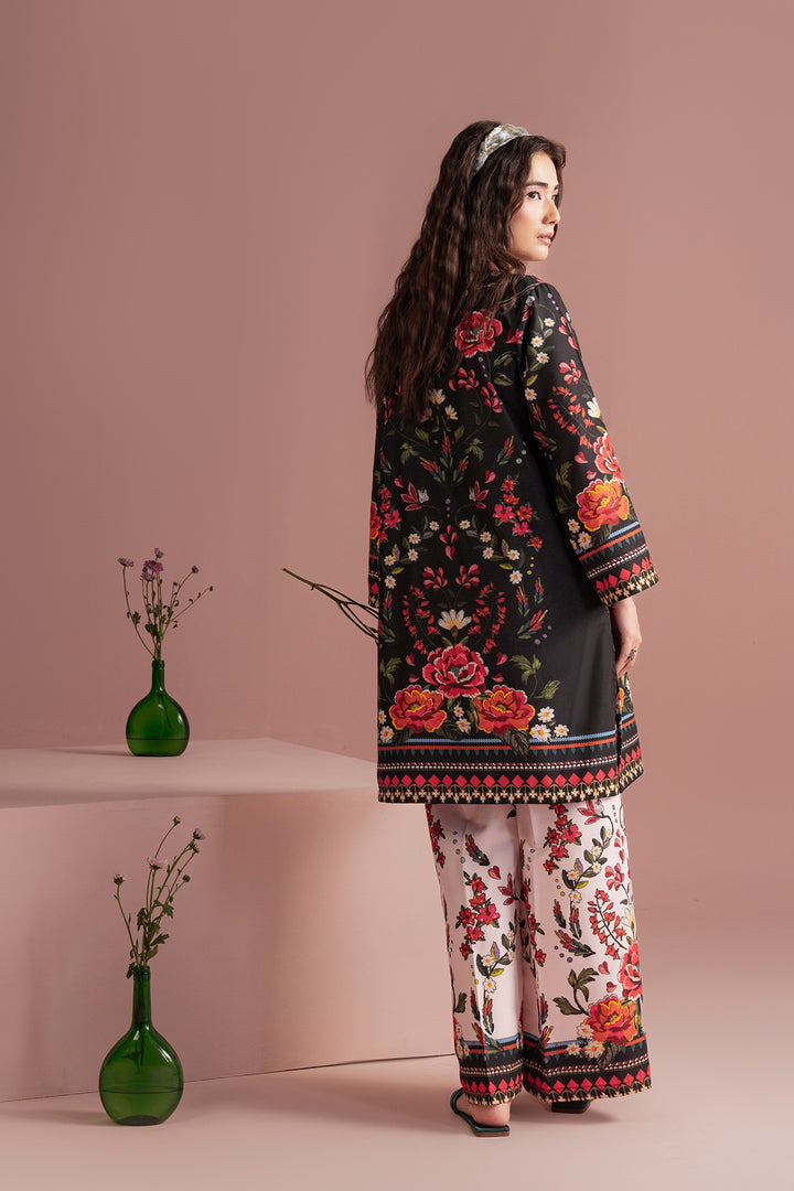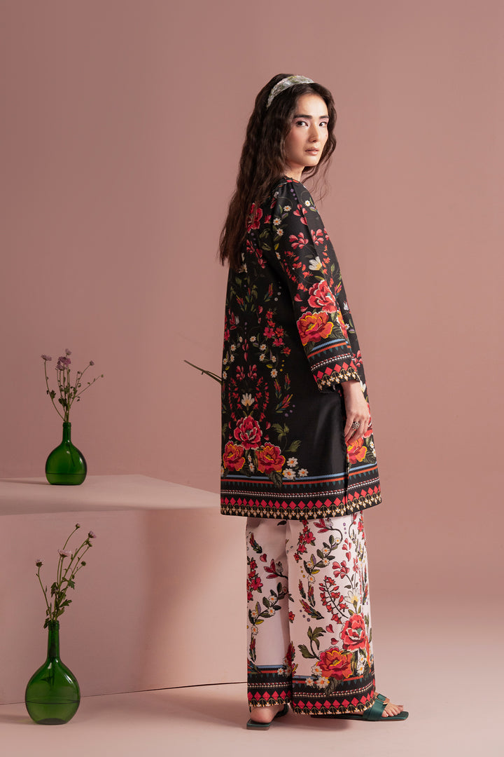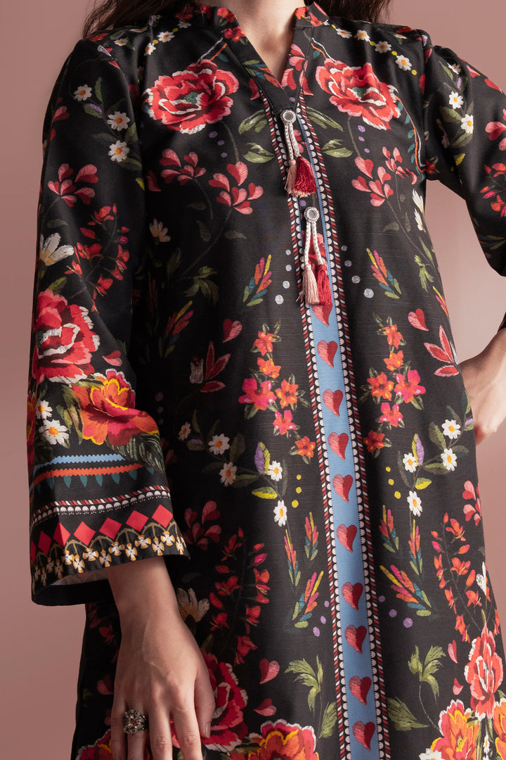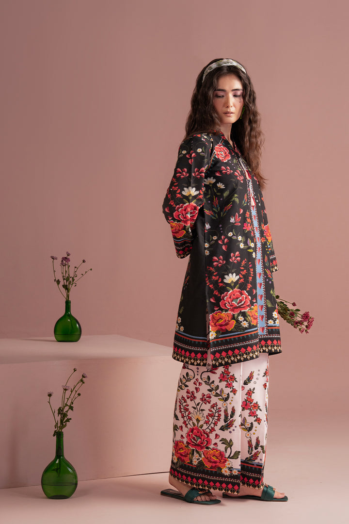 Rohma captures the essence of fall with its striking contrast and vivid florals. The black shirt is embellished with lush red and yellow botanical prints framed by intricate geometric borders. Paired with wide-legged trousers showcasing a complementary floral pattern, this ensemble is both daring and elegant — a perfect choice for those who love statement-making sophistication with an artistic edge.