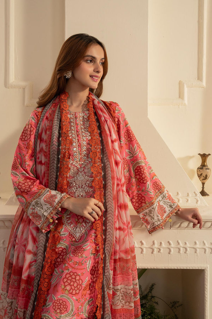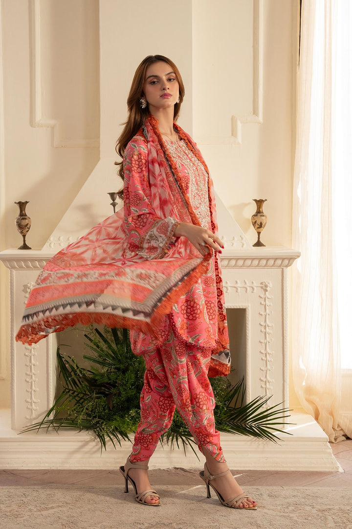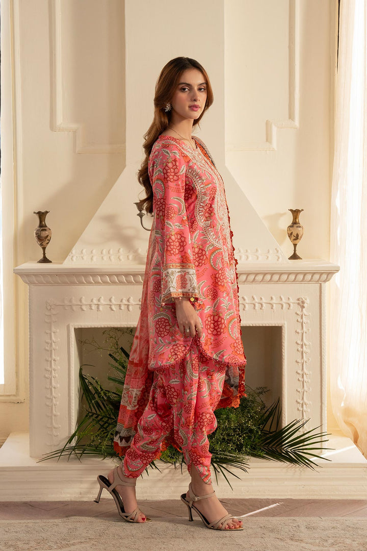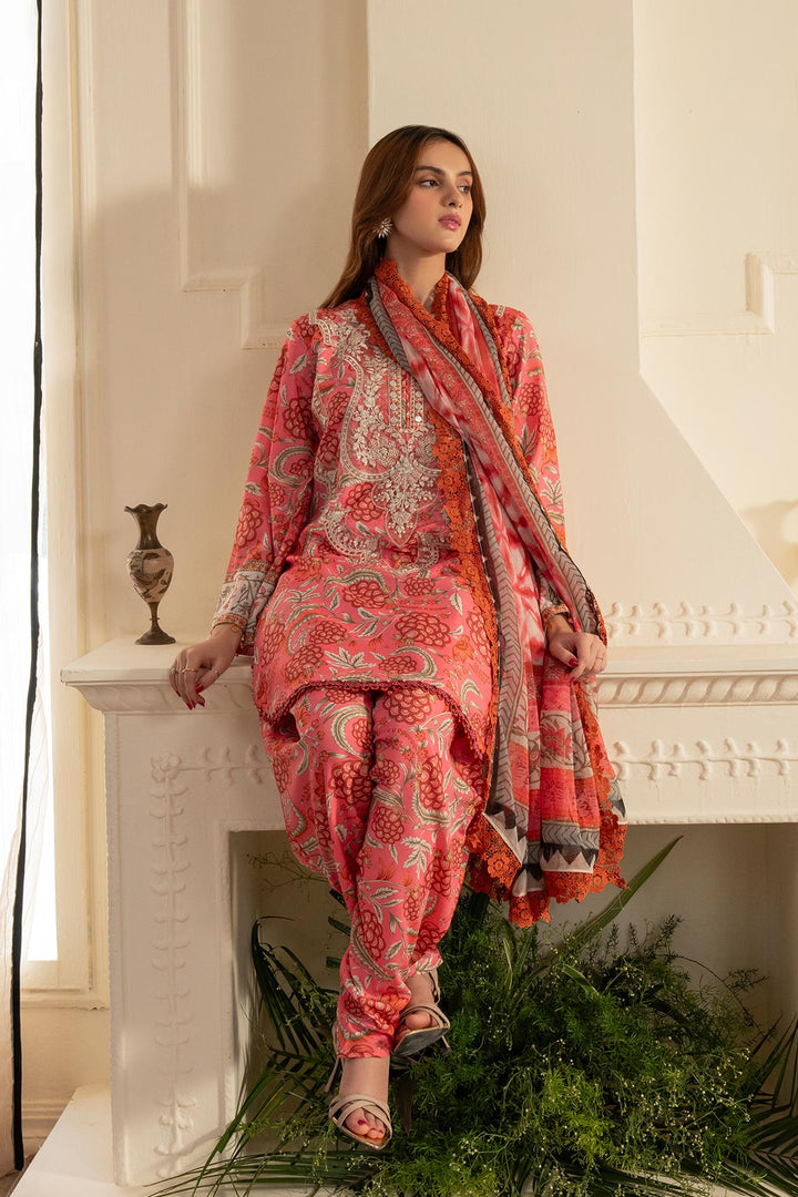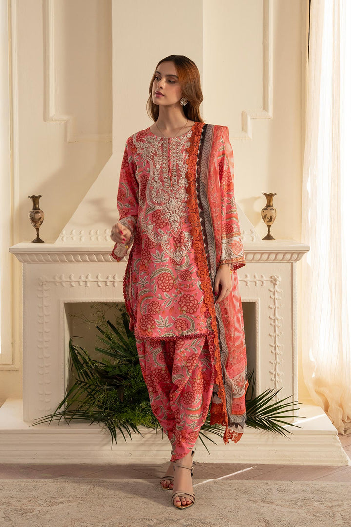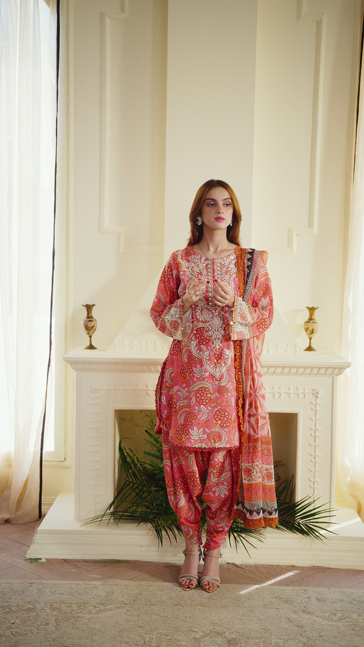 A radiant coral base infused with warm pink and orange tones, highlighted by intricate floral motifs in ivory and soft beige. The ensemble is balanced with earthy undertones and a coordinating chiffon dupatta that adds a breezy elegance.