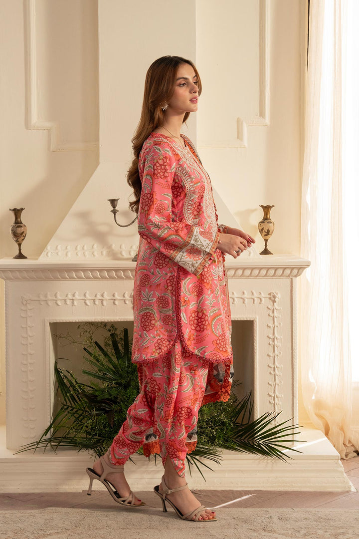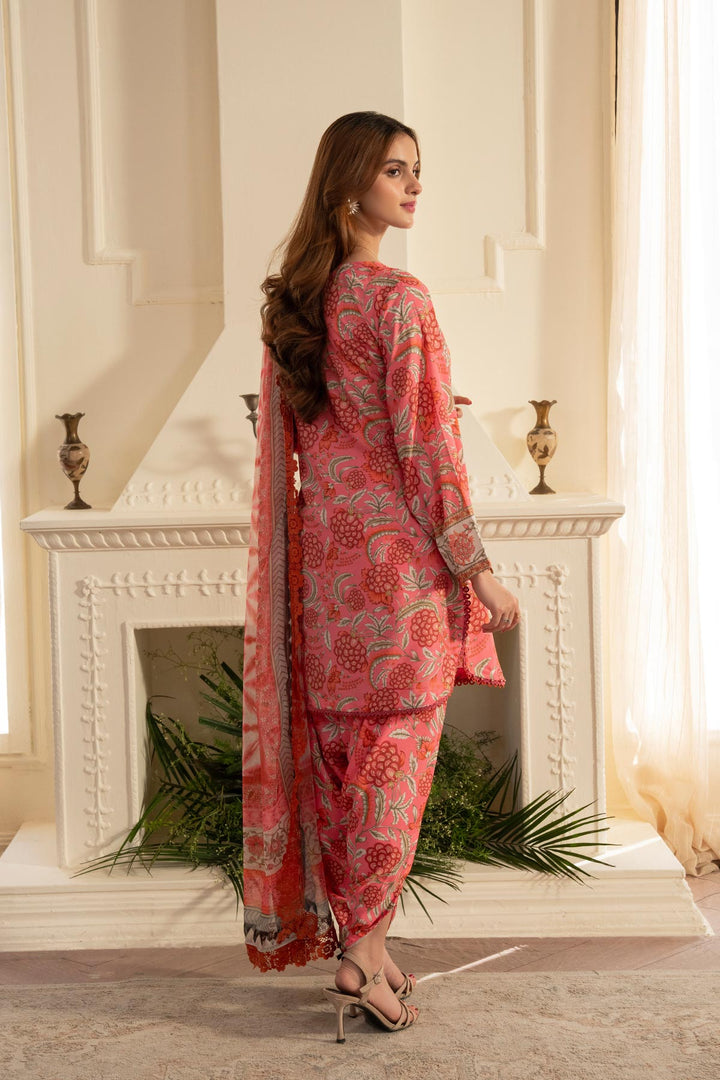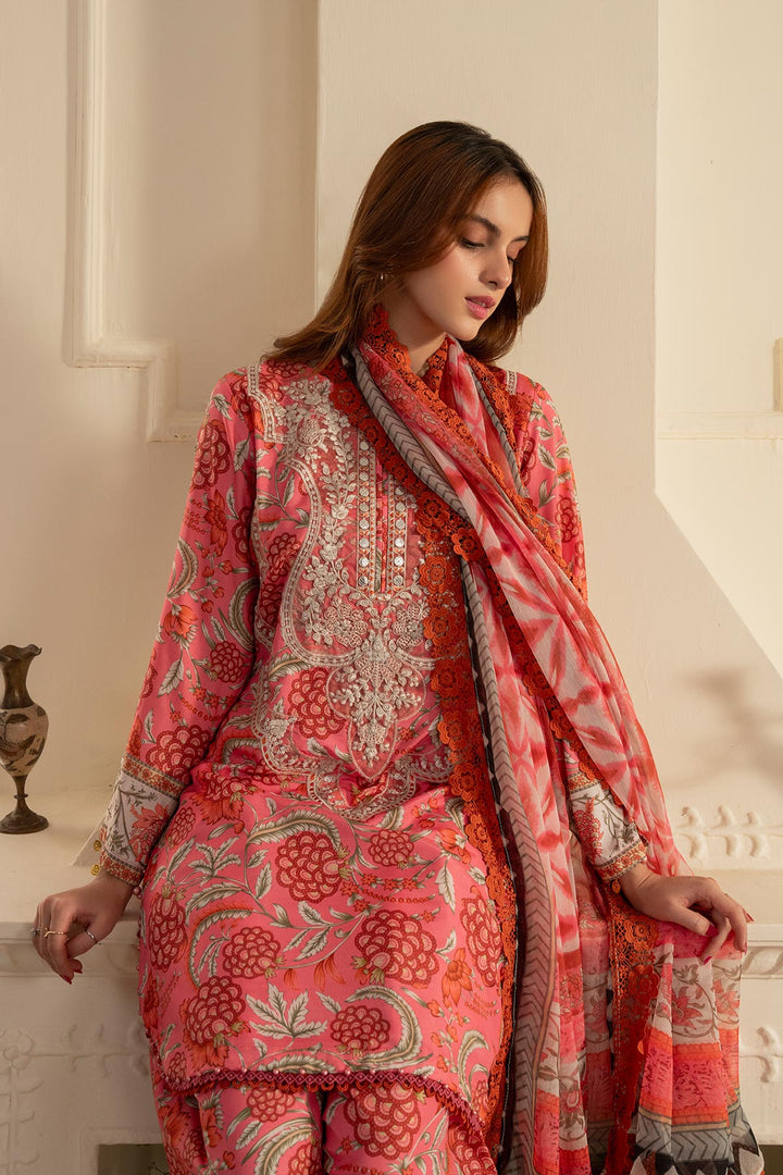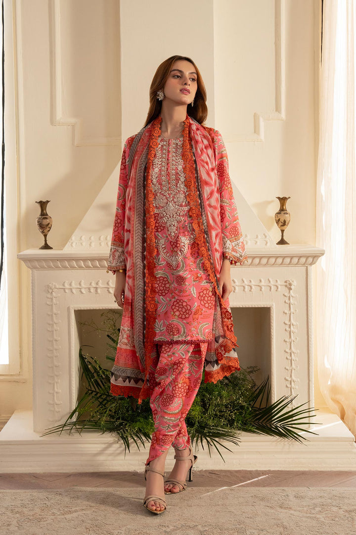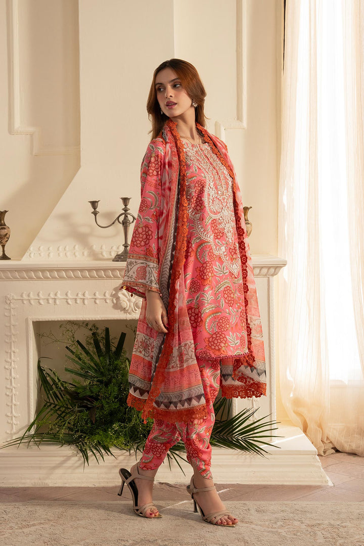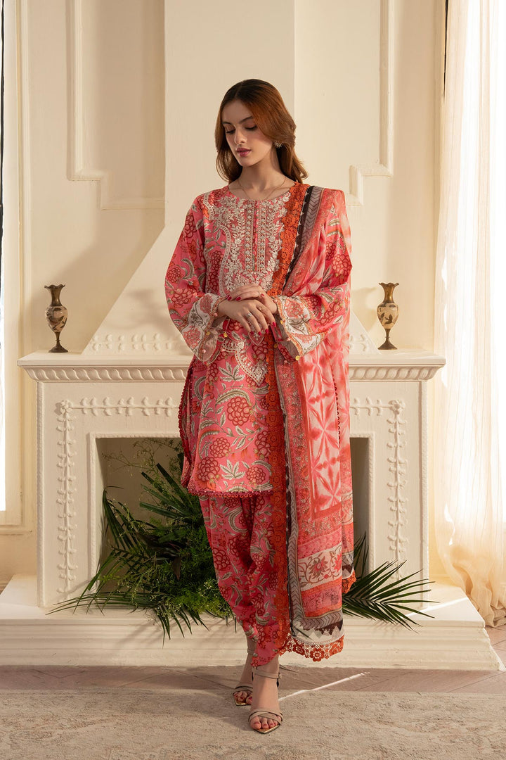 A radiant coral base infused with warm pink and orange tones, highlighted by intricate floral motifs in ivory and soft beige. The ensemble is balanced with earthy undertones and a coordinating chiffon dupatta that adds a breezy elegance.