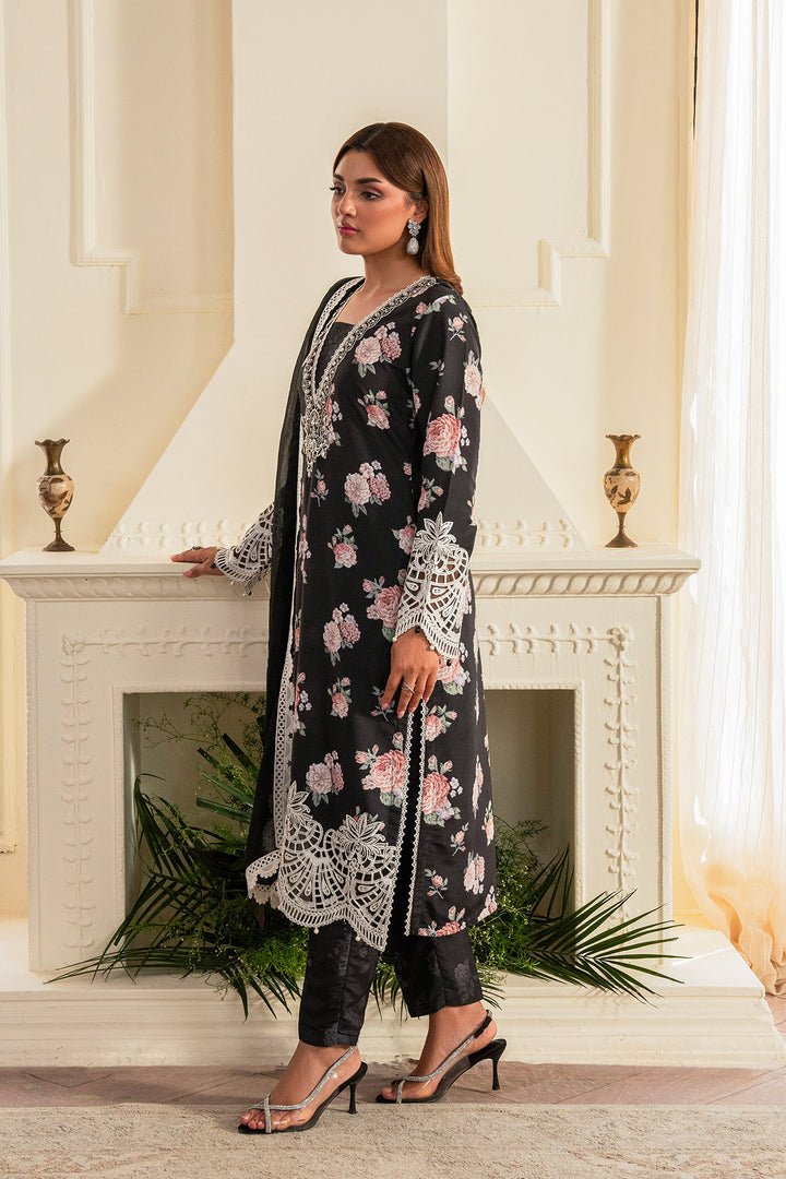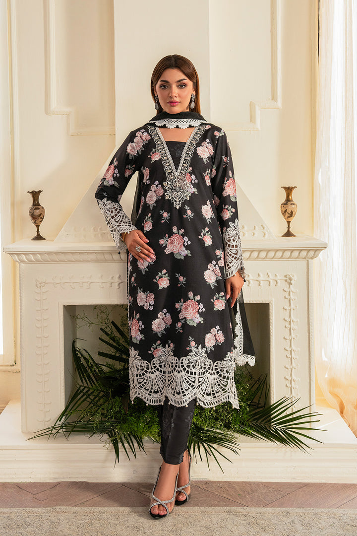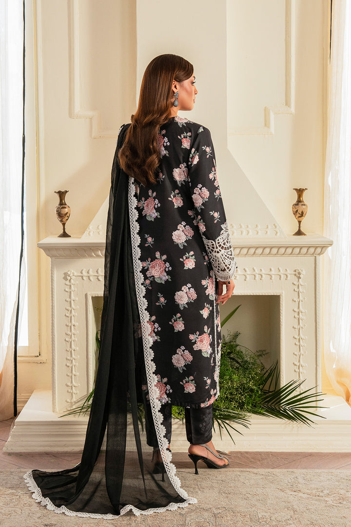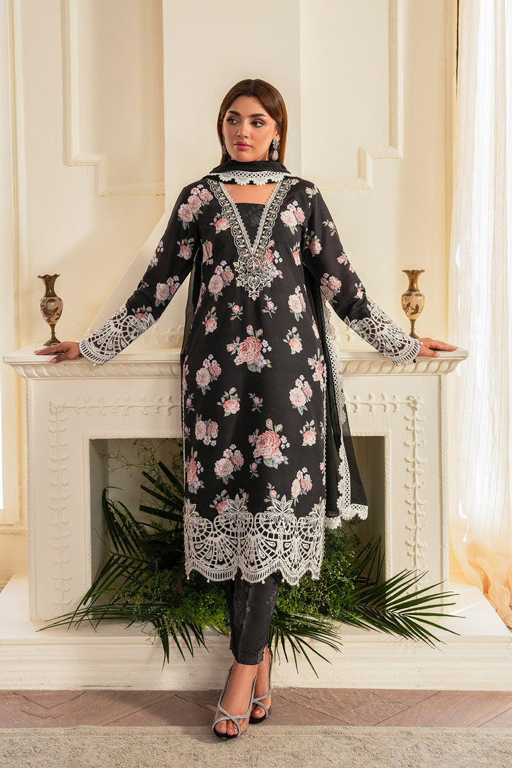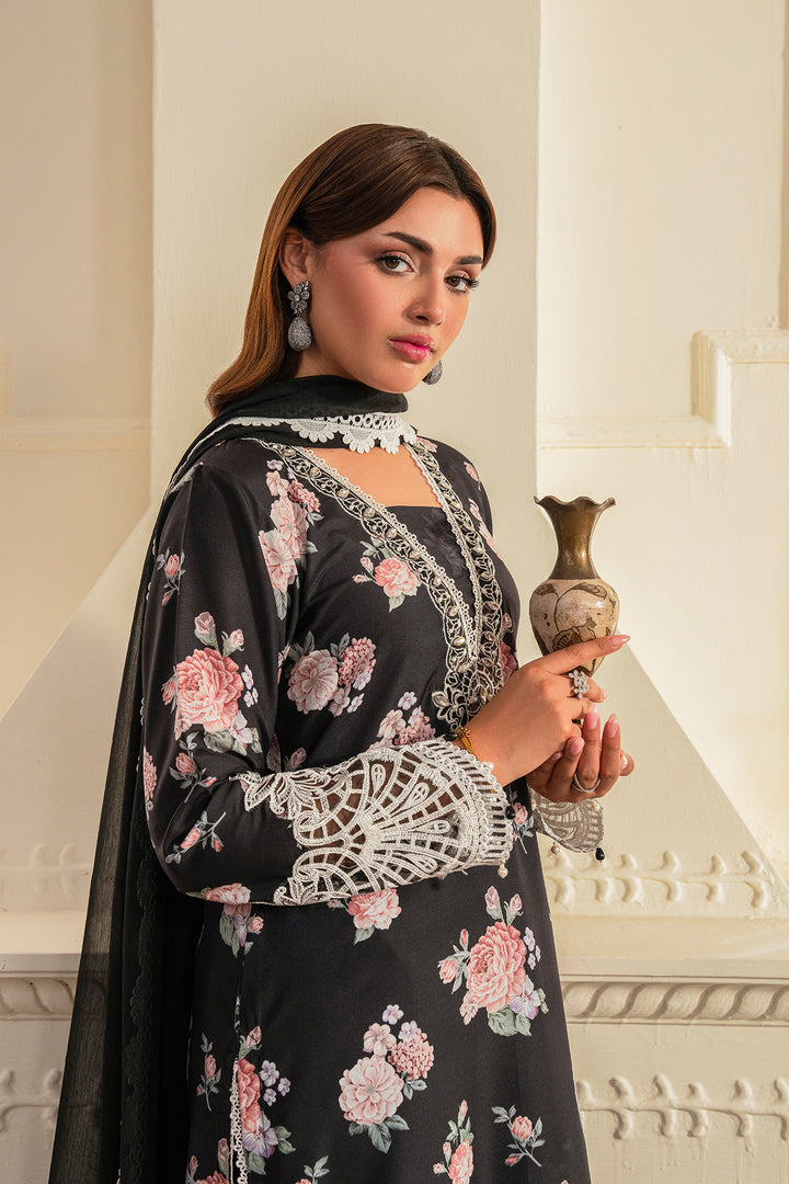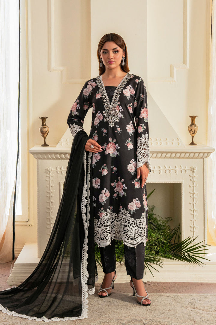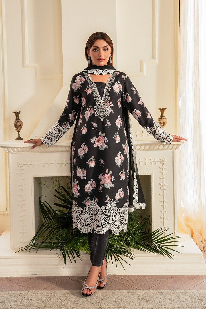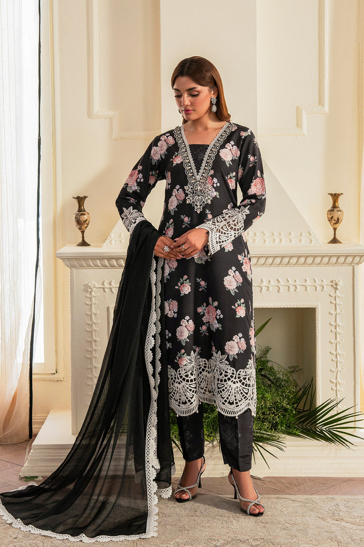 Zehra from Aik Pret’s Arsh Fall ’25 Edit is a sophisticated ensemble that blends traditional charm with modern finesse. The Silk Cambric shirt and trouser feature floral-inspired motifs in blush tones, set against a rich black base. Embroidery along the neckline and hemline adds artisanal detail, while scalloped lace accents elevate the silhouette. A flowing chiffon dupatta, framed with delicate lace, completes the look with airy elegance. Ideal for evening gatherings, festive occasions, or refined daywear, Zehra is designed for the woman who embraces grace with quiet confidence.