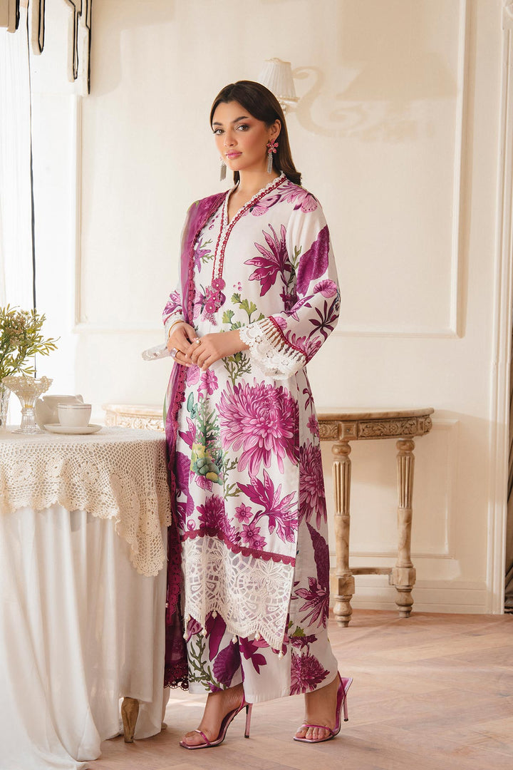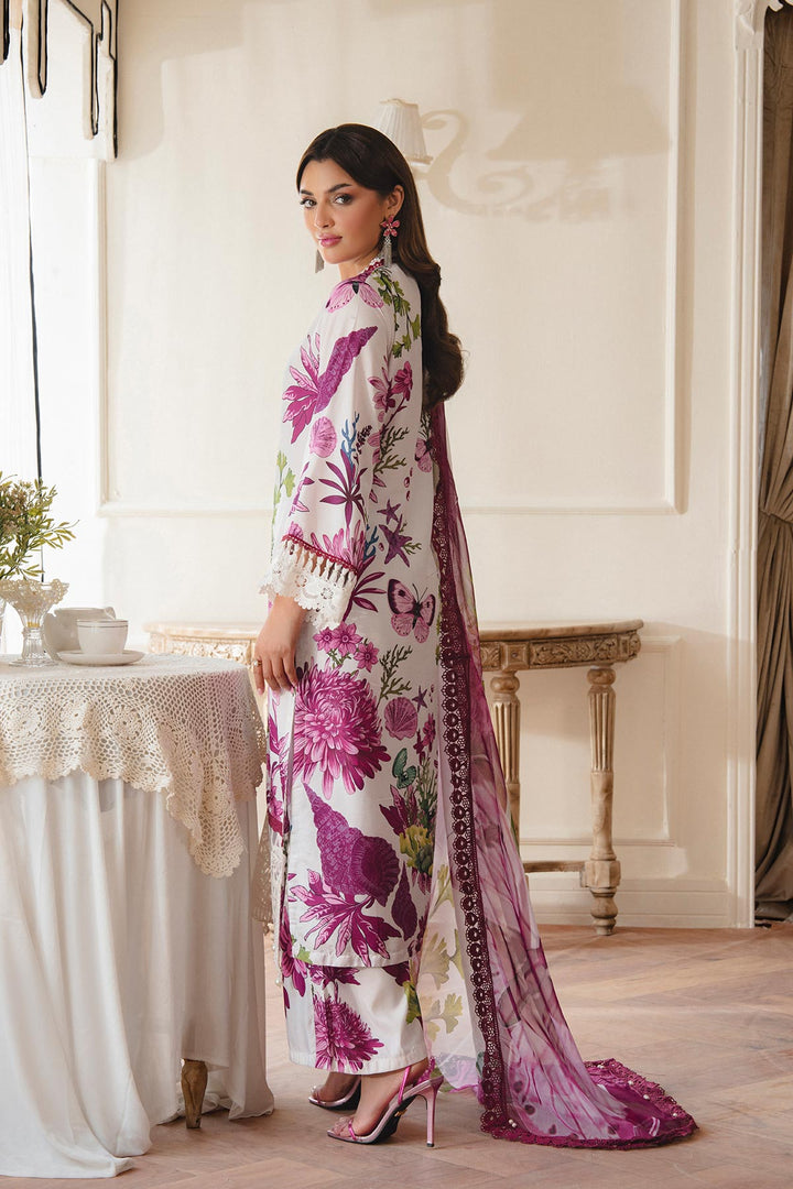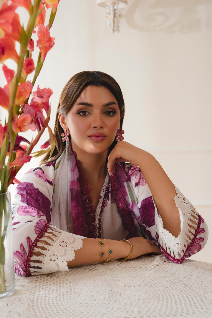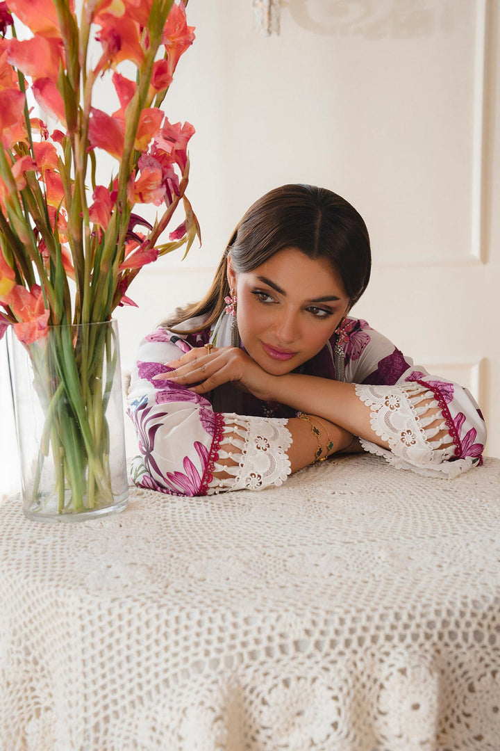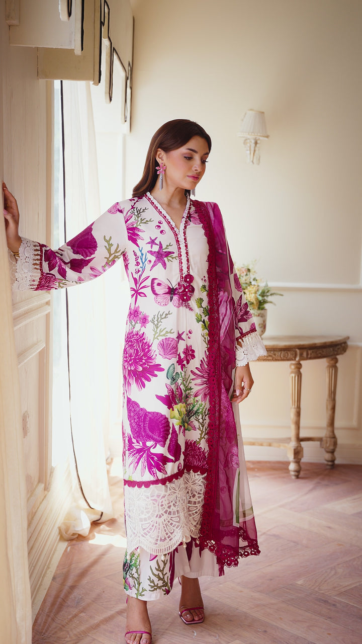 Zinnia from Aik Pret’s Arsh Fall ’25 Edit is a radiant expression of modern femininity rooted in tradition. Crafted from Silk Cambric, the long shirt features intricate floral patterns and lace detailing at the hem, paired with plazoo for a refined silhouette. The look is completed with a flowing chiffon dupatta, adorned with complementary hues that add depth and movement. Perfect for autumn gatherings, cultural festivities, or chic daytime wear, this ensemble captures the essence of effortless grace with a contemporary twist.