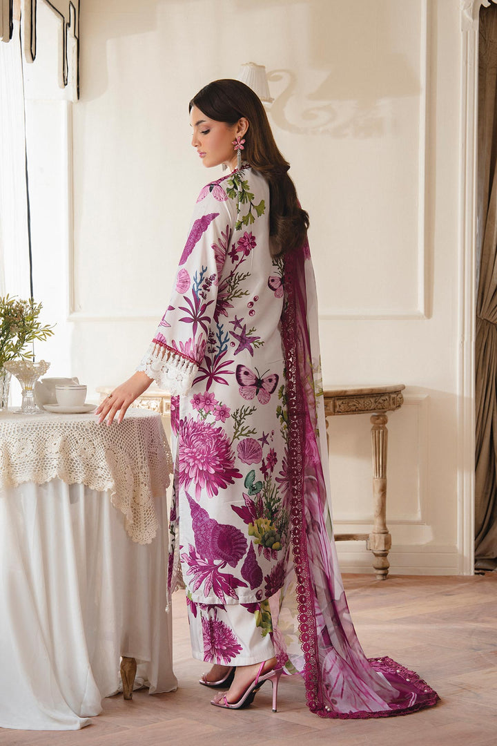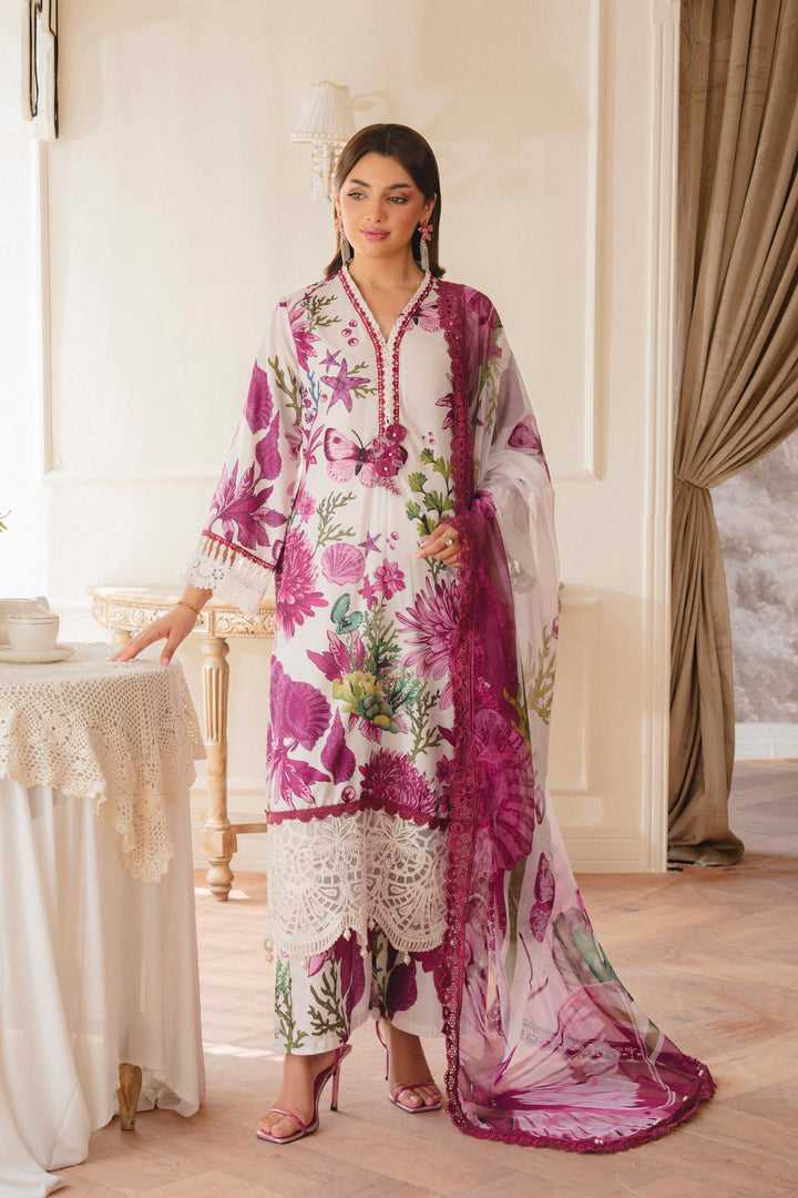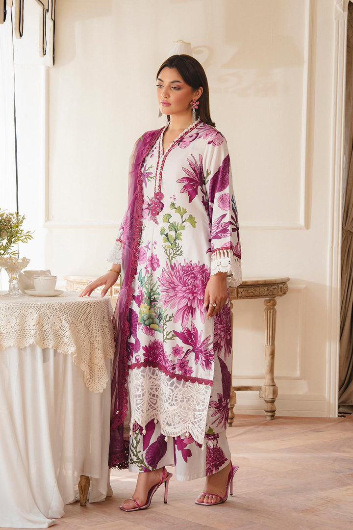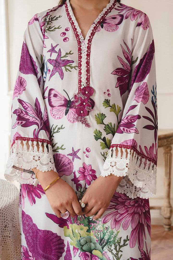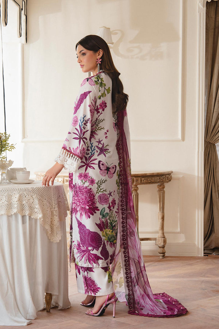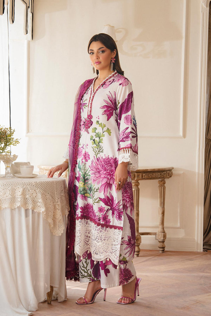 Zinnia from Aik Pret’s Arsh Fall ’25 Edit is a radiant expression of modern femininity rooted in tradition. Crafted from Silk Cambric, the long shirt features intricate floral patterns and lace detailing at the hem, paired with plazoo for a refined silhouette. The look is completed with a flowing chiffon dupatta, adorned with complementary hues that add depth and movement. Perfect for autumn gatherings, cultural festivities, or chic daytime wear, this ensemble captures the essence of effortless grace with a contemporary twist.